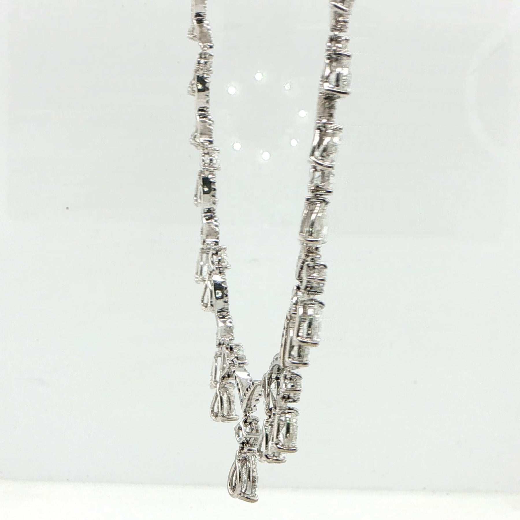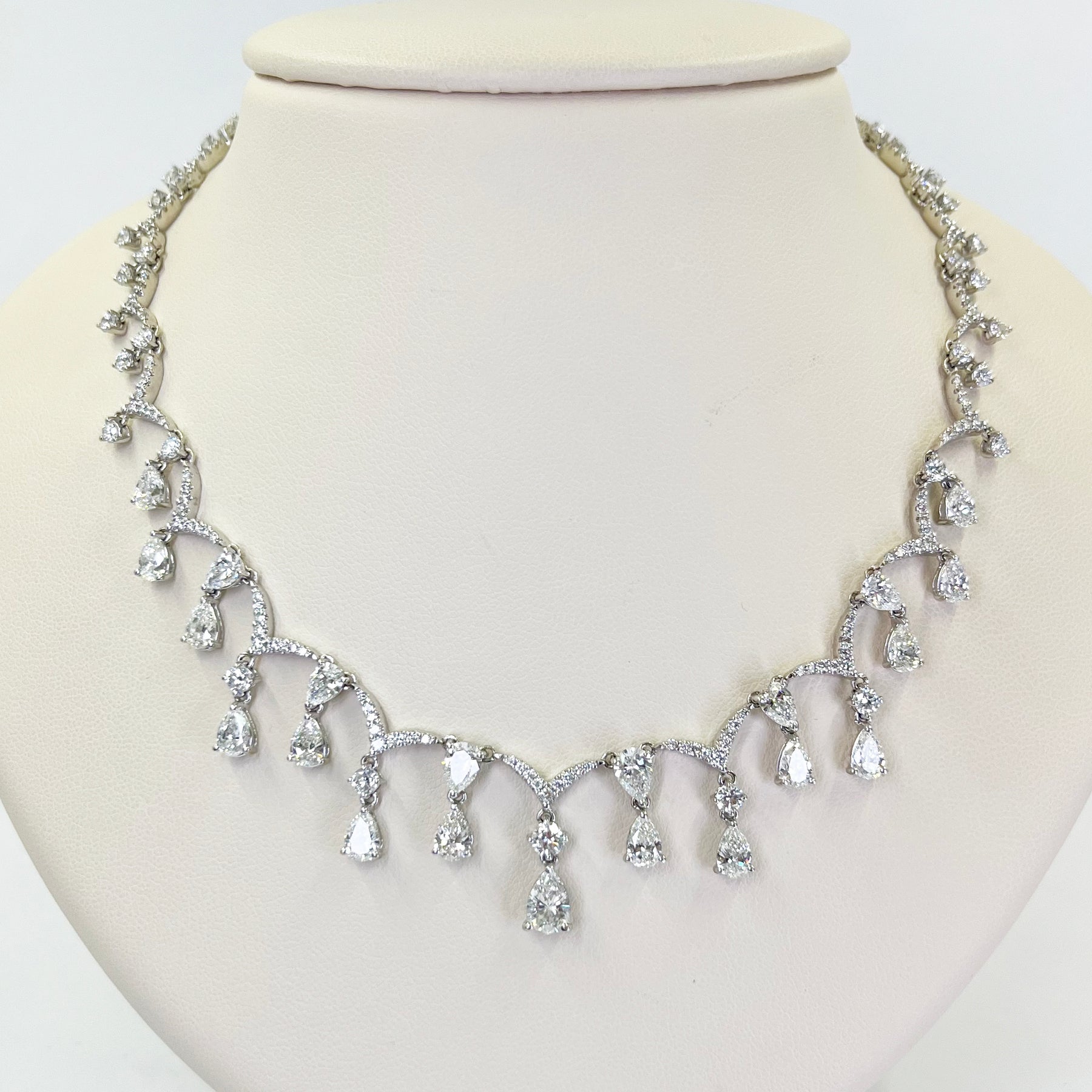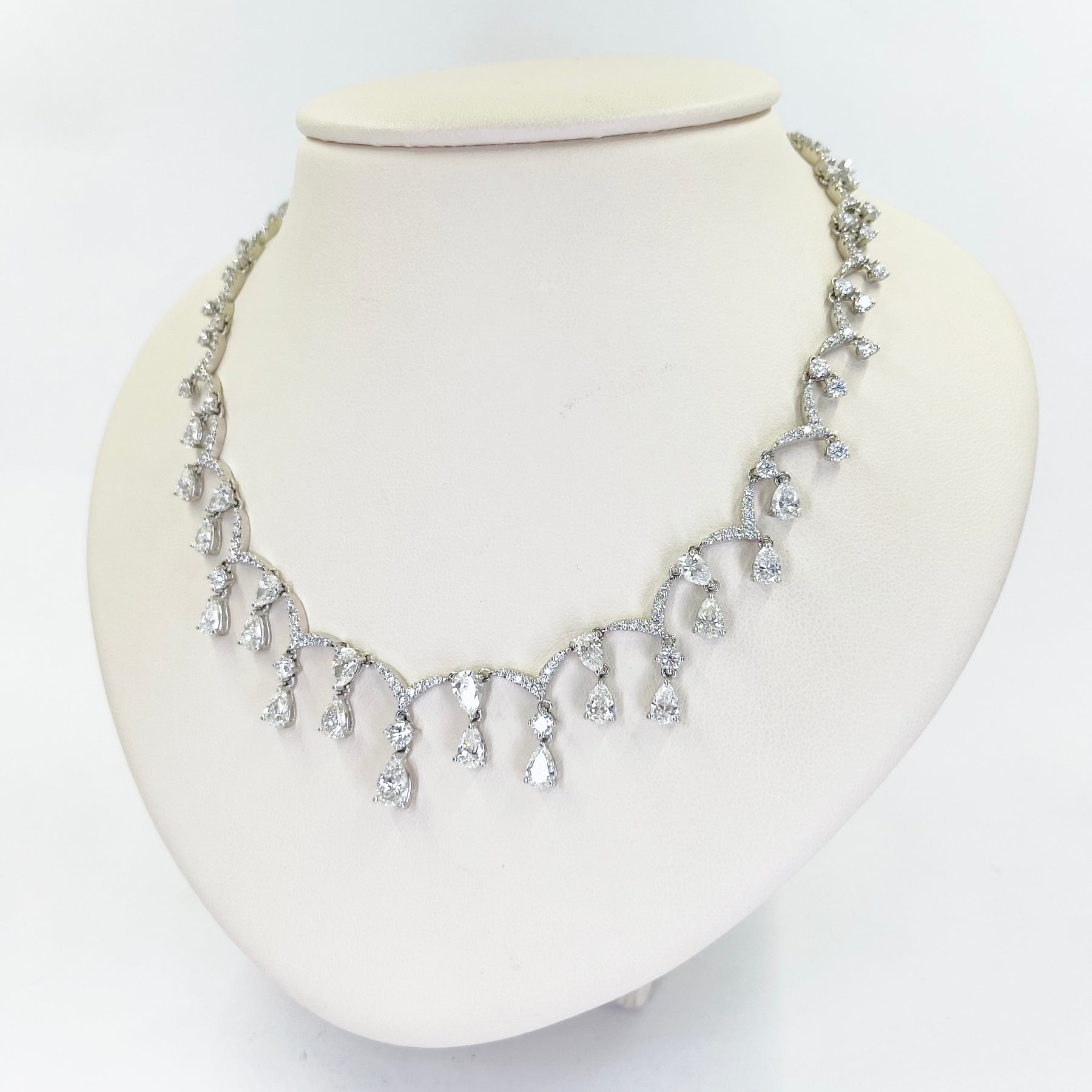 This 18 karat white gold necklace featuring 21 pear cut diamonds totaling 7.3 carats accented by 272 round cut diamonds totaling 6.67 carats with length is 17 inches with box clasp closure weighing 26.14 grams total showcases extraordinary white gold necklace construction with pear diamond design and exceptional diamond weight. The luxury diamond necklace offers substantial carat weight while pear and round diamonds provide spectacular brilliance for investment grade jewelry appeal with impressive diamond count and statement necklace styling. Pear diamond necklace offers exceptional collector jewelry value with premium white gold perfect for fine jewelry collection and diamond jewelry connoisseurs seeking statement diamond necklaces and elegant necklace design with nearly 14 carats total diamond weight.