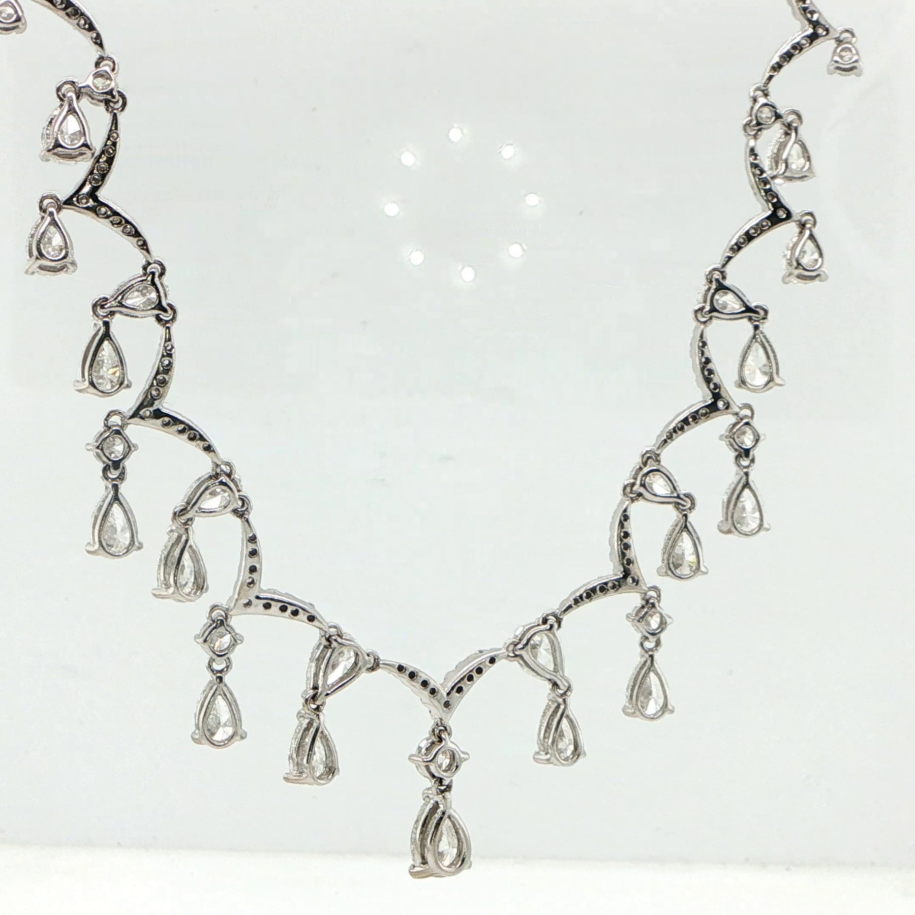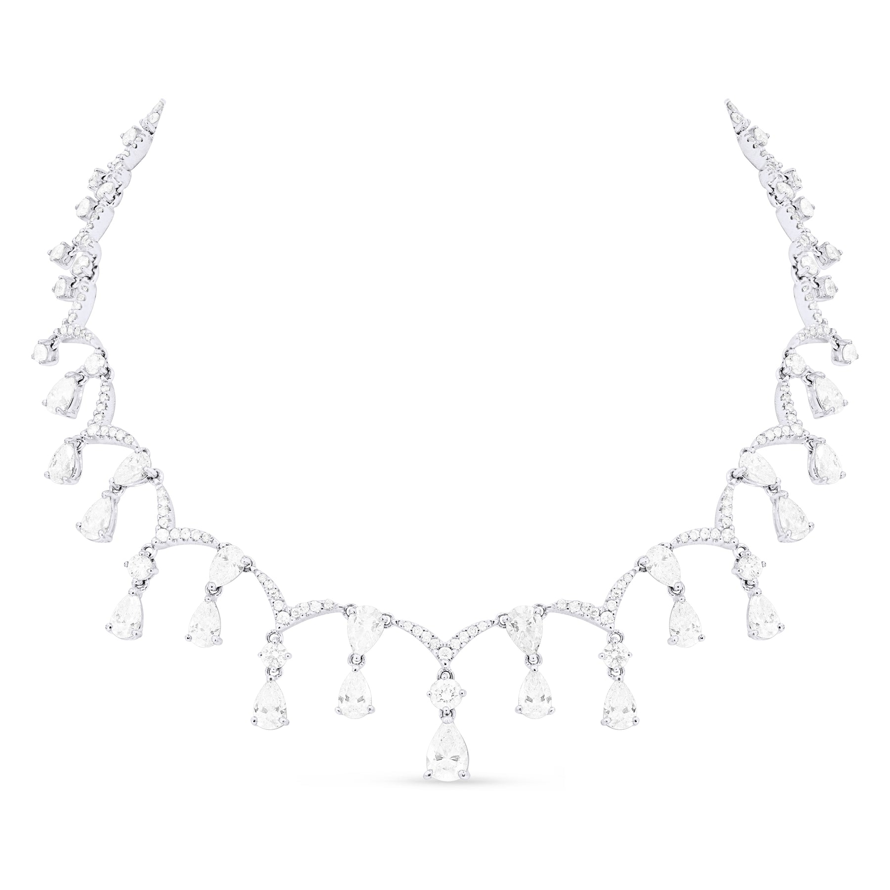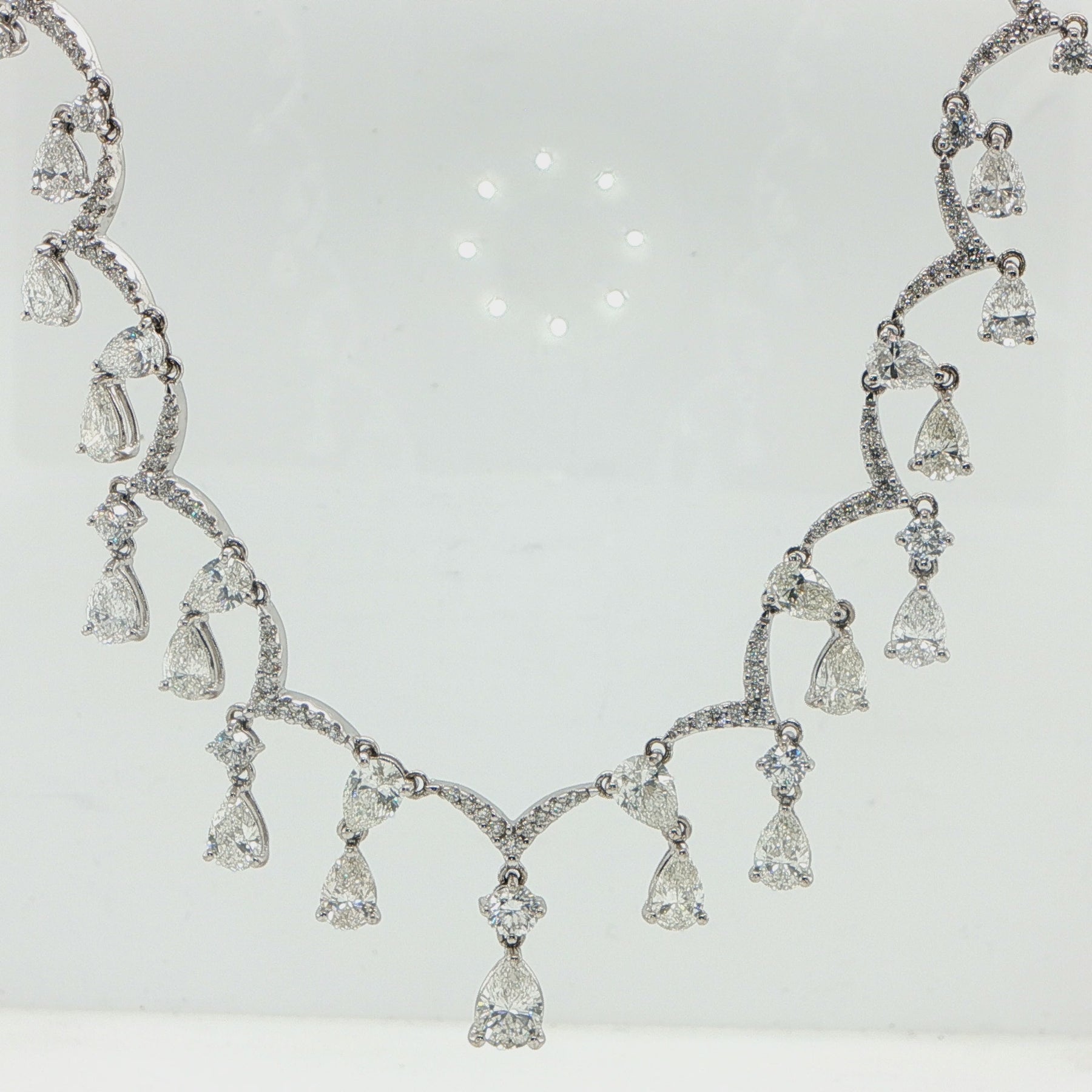 This 18 karat white gold necklace featuring 21 pear cut diamonds totaling 7.3 carats accented by 272 round cut diamonds totaling 6.67 carats with length is 17 inches with box clasp closure weighing 26.14 grams total showcases extraordinary white gold necklace construction with pear diamond design and exceptional diamond weight. The luxury diamond necklace offers substantial carat weight while pear and round diamonds provide spectacular brilliance for investment grade jewelry appeal with impressive diamond count and statement necklace styling. Pear diamond necklace offers exceptional collector jewelry value with premium white gold perfect for fine jewelry collection and diamond jewelry connoisseurs seeking statement diamond necklaces and elegant necklace design with nearly 14 carats total diamond weight.