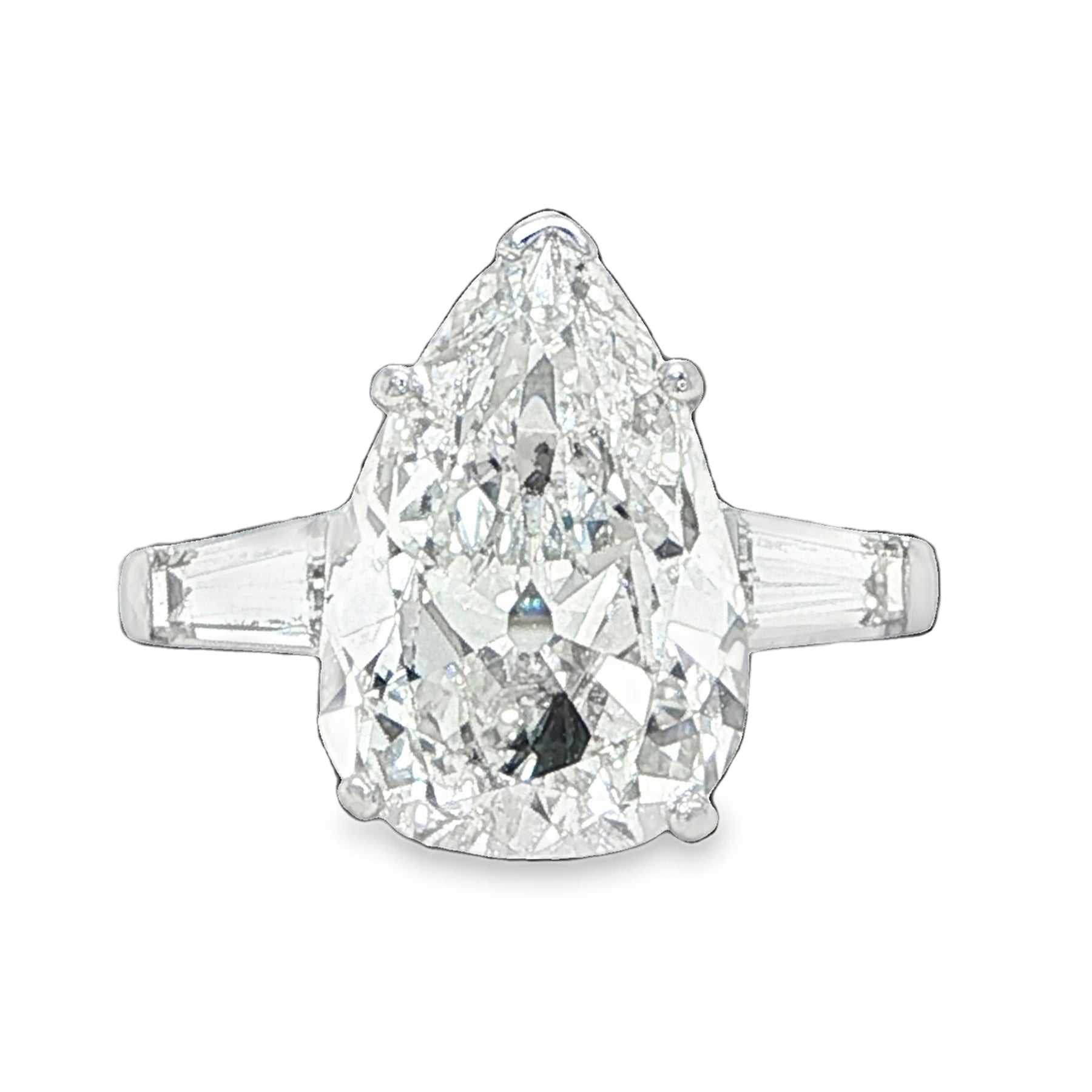 This exceptional three-stone engagement ring is masterfully crafted in platinum and features a breathtaking 4.23 carat pear-cut diamond at its center. The diamond is GIA graded with a J color and VS1 clarity, offering beautiful brilliance, presence, and fire in an elegant pear silhouette.