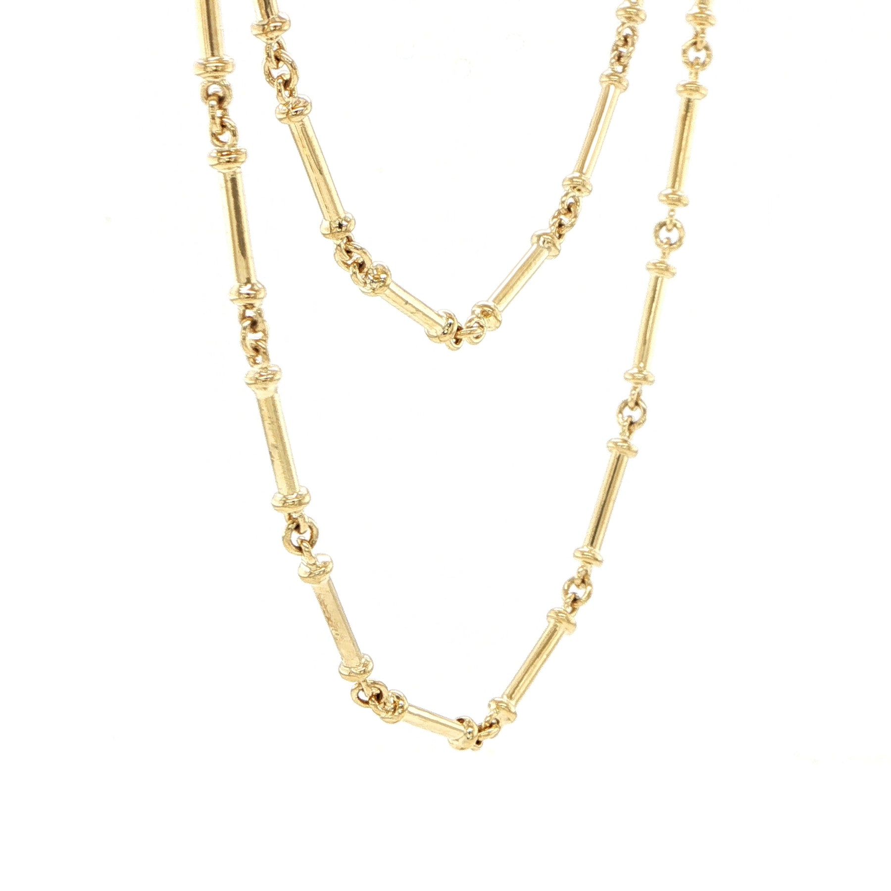 This sophisticated 18 karat yellow gold bar link necklace features a sleek 2.6mm width and an exceptional 35-inch length, offering endless styling versatility. Crafted in solid 18K gold, each elongated bar link reflects light with a clean, modern shine, creating a refined silhouette ideal for layering, doubling, or wearing as a single dramatic chain. The piece is secured with a polished lobster clasp for durability and ease of wear. With a finished weight of 20.4 grams, the necklace provides substantial presence without feeling heavy, making it perfect for both everyday luxury and elevated occasions. Timeless, elegant, and effortlessly chic, this 18K bar link chain is a standout essential in any fine-jewelry wardrobe.