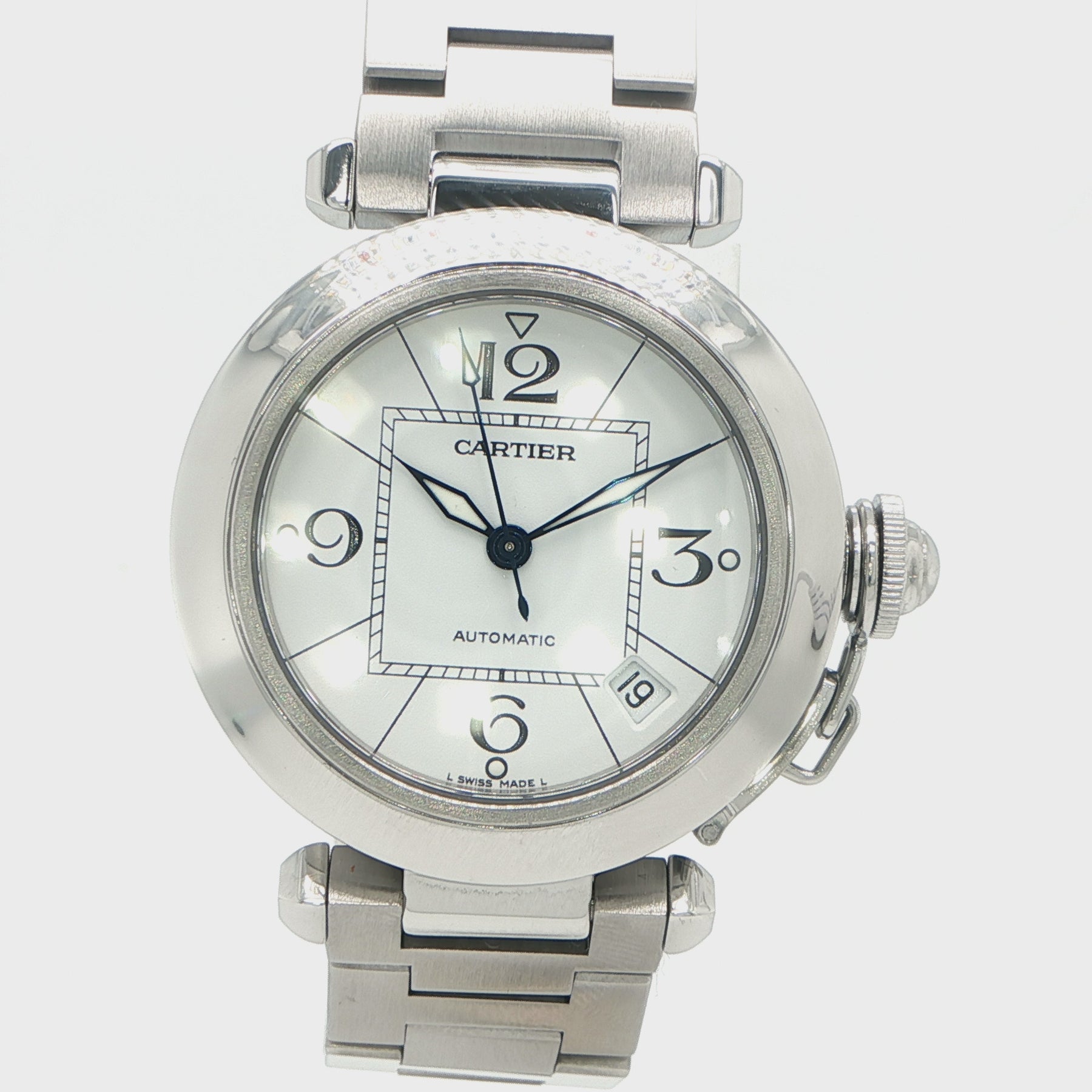 This refined pre-owned Cartier Pasha wristwatch showcases the iconic elegance and bold design language that has defined Cartier for generations. Crafted in stainless steel with a 35mm case, this automatic timepiece features a clean white dial with a date function, offering timeless style with everyday functionality.