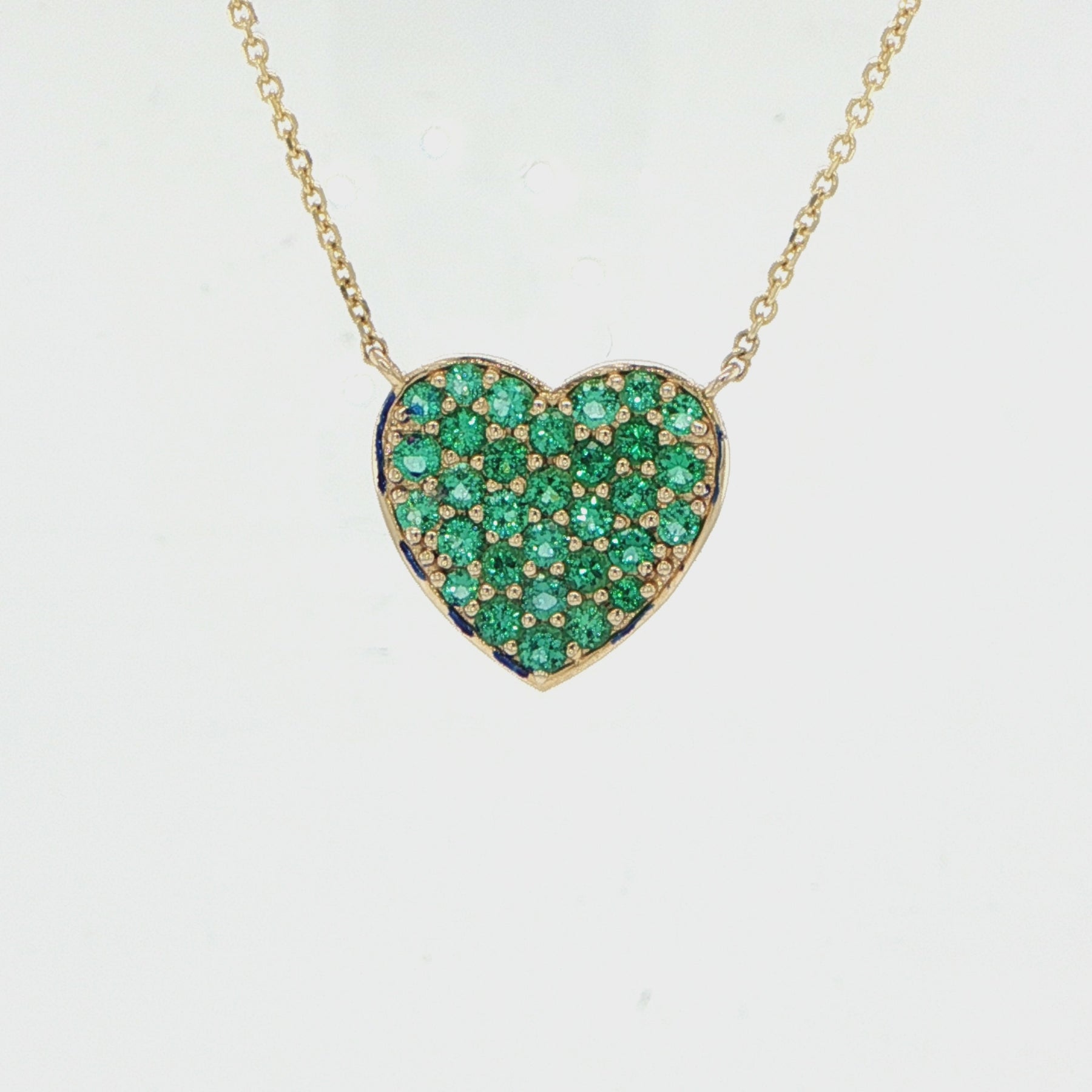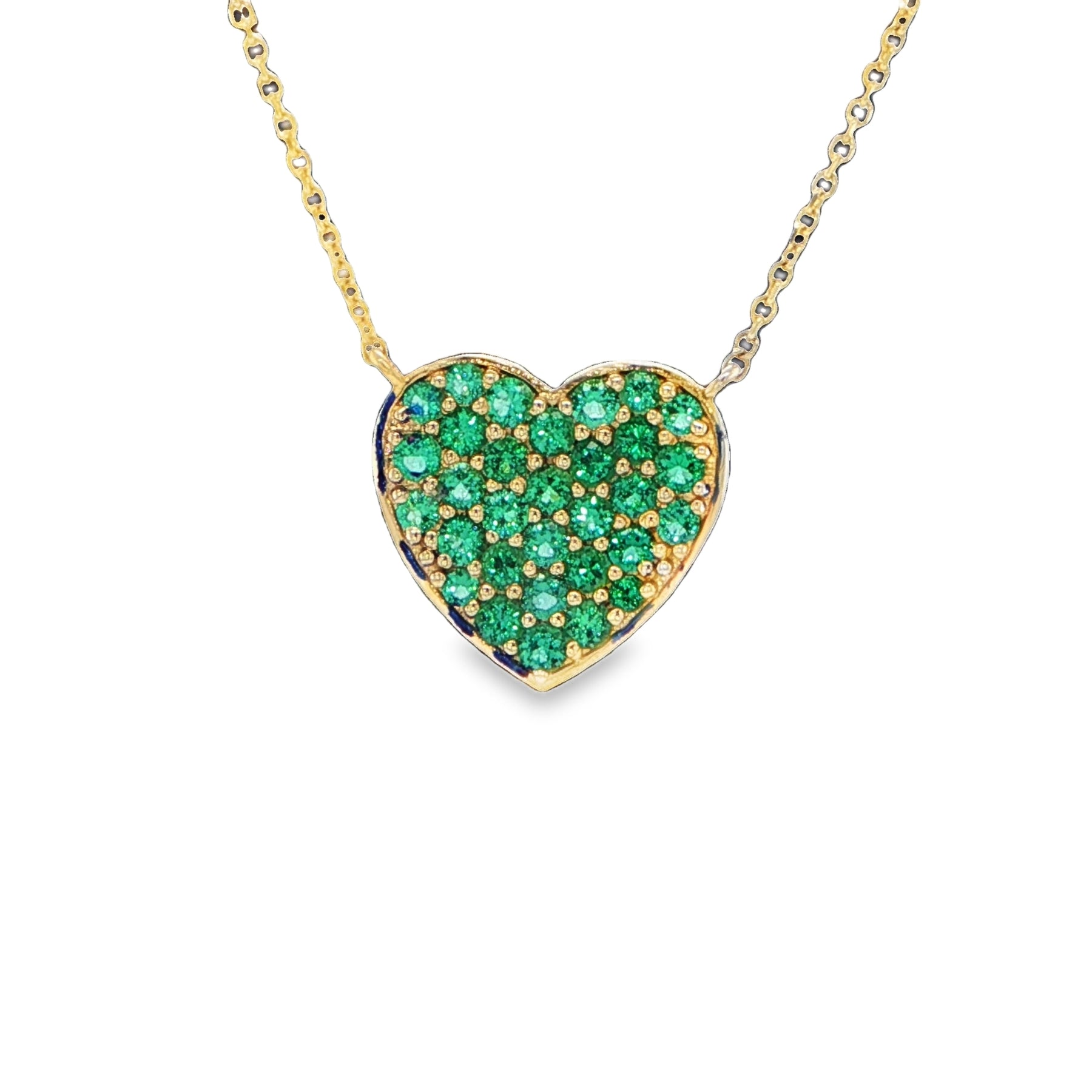 This 14 karat yellow gold heart necklace featuring round cut emeralds totaling 0.83 carats with length is 16-18 inches with lobster clasp closure and finished weight of 3.5 grams showcases romantic yellow gold necklace construction with emerald heart pendant and adjustable chain length styling. The emerald gemstone necklace offers natural emerald stones while heart pendant design provides sentimental elegance for luxury gemstone jewelry appeal with emerald green color and romantic heart shape. Gemstone heart necklace offers excellent investment grade emeralds value with adjustable necklace length perfect for fine jewelry collection and gemstone jewelry enthusiasts seeking emerald pendant necklaces and romantic jewelry styling with vibrant green gemstones.