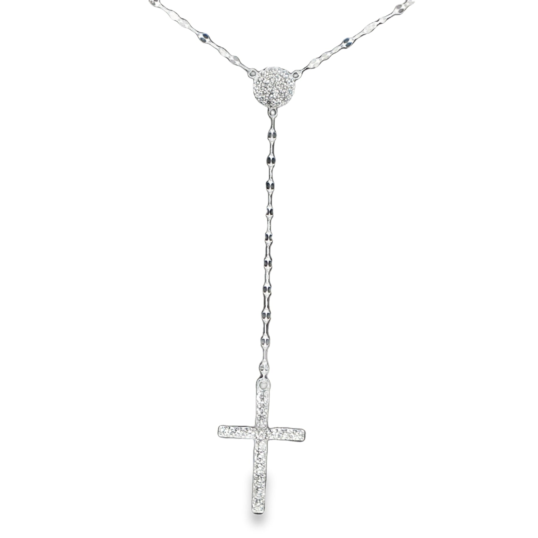 This 14 karat white gold cross necklace featuring 25 round cut diamonds with VS clarity diamonds and G color diamonds totaling 0.35 carats with length is 16-18 inches with lobster clasp closure and finished weight of 2.5 grams showcases elegant white gold necklace construction with diamond cross pendant and religious jewelry styling. The diamond cross necklace offers VS clarity quality while white gold construction provides timeless elegance for faith based jewelry appeal with adjustable chain length and premium diamond quality. Religious cross pendant offers excellent investment grade diamonds value with white gold jewelry perfect for fine jewelry collection and religious jewelry enthusiasts seeking diamond cross necklaces and Christian jewelry styling with adjustable length feature.