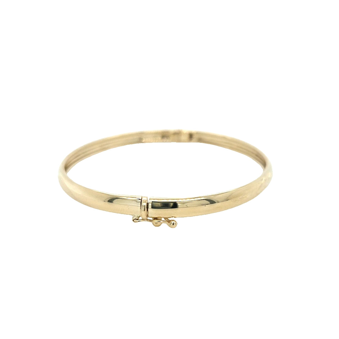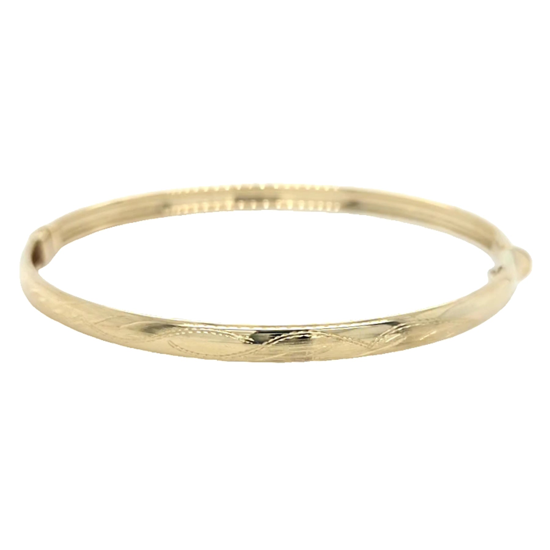 This 14 karat yellow gold 4.3mm textured bangle measuring 6.50 inches long features secure figure 8 safety clasp weighing 7.7 grams total in elegant yellow gold bracelet construction with textured bangle design and solid gold construction. The gold bangle bracelet showcases textured surface finish while yellow gold bangle provides classic styling for luxury gold jewelry appeal with safety clasp closure and comfortable bangle fit. Textured gold bracelet offers excellent investment grade gold value with substantial bangle weight perfect for fine jewelry collection and jewelry enthusiasts seeking classic gold bangles with textured bracelet styling and secure clasp design.