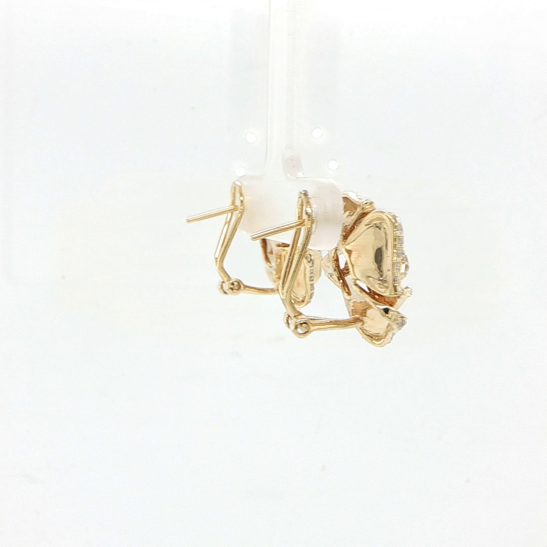 These 14 karat yellow gold flower studs featuring 116 round cut diamonds totaling 0.71 carats with pierced post and omega back closure and finished weight of 9.84 grams showcase exquisite yellow gold earrings construction with floral design motif and substantial diamond weight. The diamond flower earrings offer impressive diamond count while pave diamond setting provides continuous sparkle for luxury diamond jewelry appeal with flower stud styling and secure omega backs. Floral diamond earrings offer excellent investment grade diamonds value with substantial earring weight perfect for fine jewelry collection and diamond jewelry enthusiasts seeking nature inspired earrings and statement stud styling with premium diamond coverage.