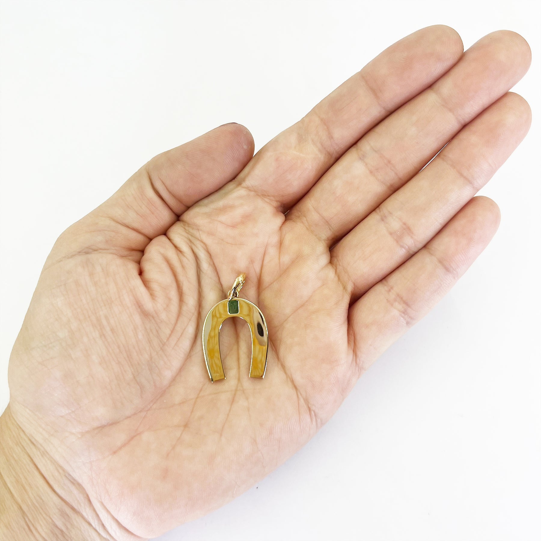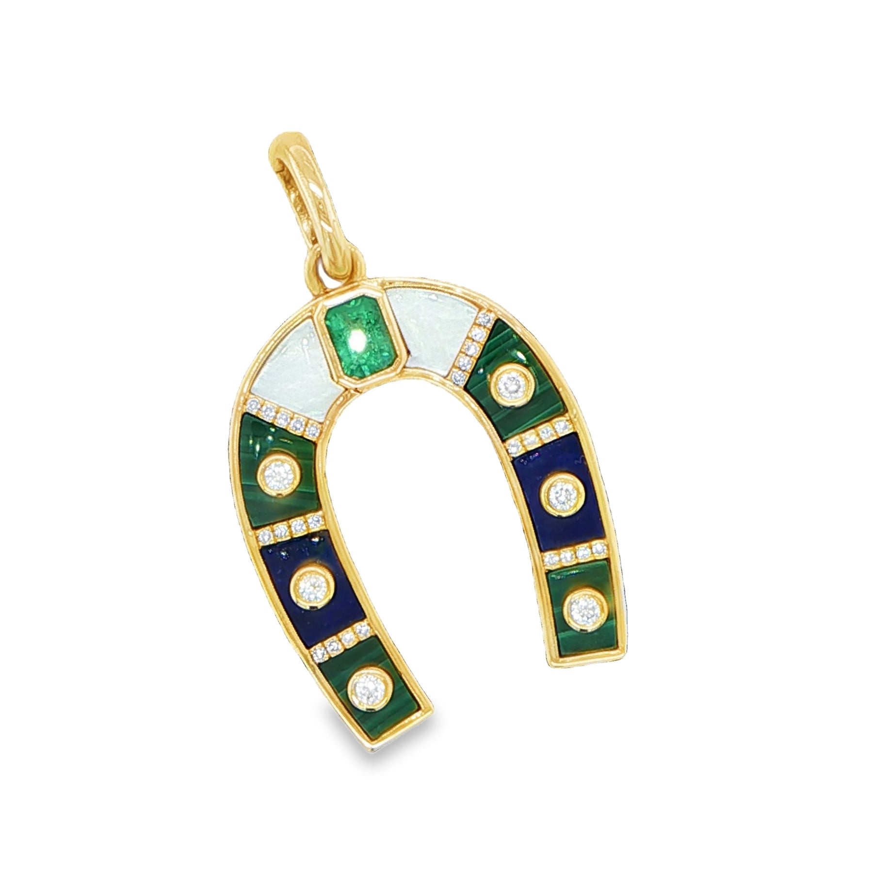 This 14K Yellow Gold Horseshoe Pendant brings modern sophistication to a timeless good-luck motif. Crafted in solid 14K yellow gold, it features a glowing 0.20-carat emerald-cut emerald, accented by 32 round brilliant diamonds of SI clarity and G/H color, totaling 0.14 carats. The design is elevated with a colorful inlay of mother of pearl, malachite, and lapis lazuli, adding depth and dimension to the piece. A hinged enhancer clip allows it to be worn effortlessly on your favorite chain or strand of pearls, offering endless styling versatility.