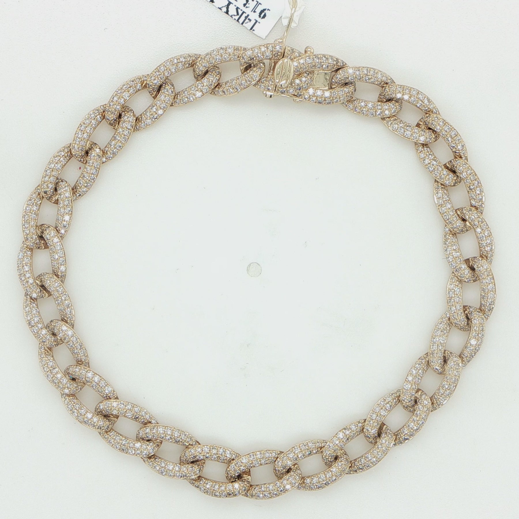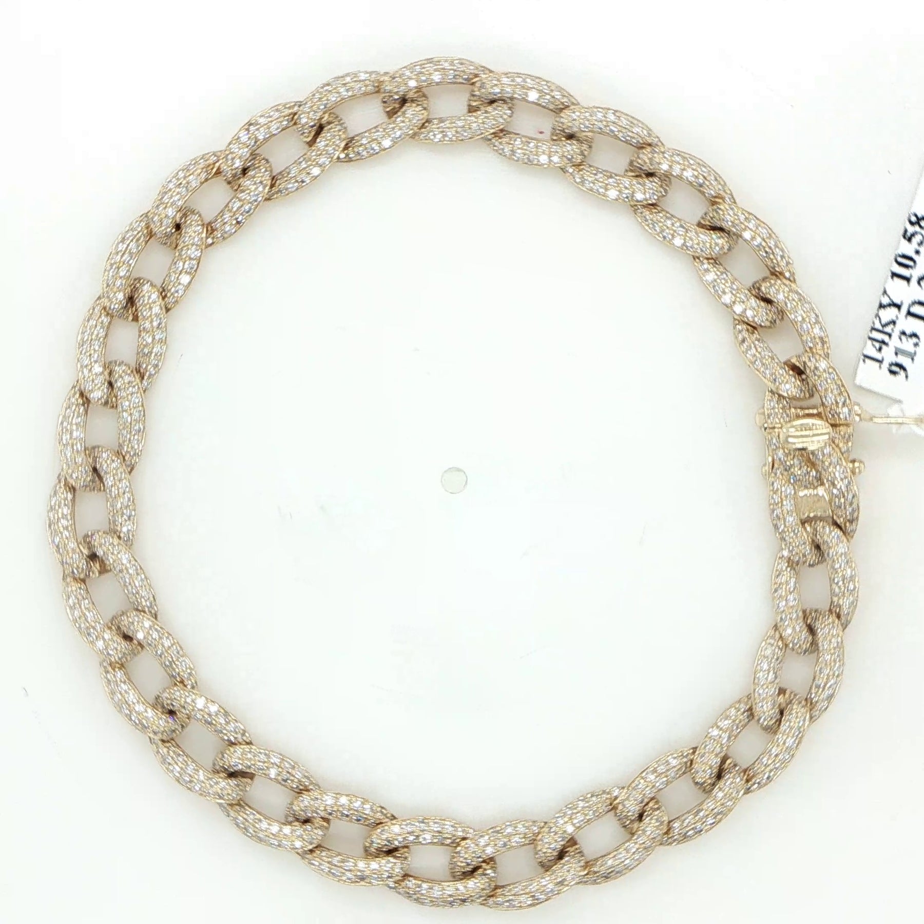 This 14 karat yellow gold pave diamond curb link bracelet featuring 913 round diamonds totaling 2.28 carats measuring 6.5 inches long with hidden box clasp and double figure 8 safety mechanisms showcases spectacular yellow gold bracelet construction with pave diamond setting and curb link design. The diamond curb bracelet offers continuous diamond sparkle while pave setting design provides maximum brilliance for luxury diamond bracelet appeal with impressive diamond count and secure clasp system. Pave diamond bracelet offers excellent investment grade diamonds value with yellow gold construction perfect for fine jewelry collection and diamond jewelry enthusiasts seeking premium pave diamonds and sophisticated bracelet styling with double safety features.