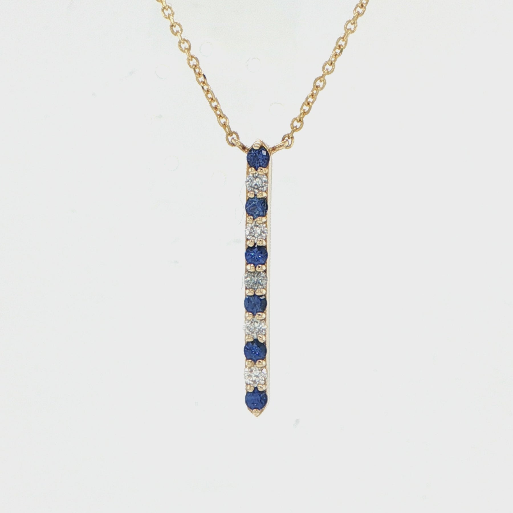 This 14 karat yellow gold bar necklace featuring 6 round cut sapphires totaling 0.24 carats accented by 5 round cut diamonds with SI1 clarity diamonds and G/H color diamonds totaling 0.15 carats with length is 16-18 inches with lobster clasp closure and finished weight of 3.1 grams showcases contemporary yellow gold necklace construction with sapphire diamond design and bar pendant styling. The sapphire bar necklace offers blue sapphire gemstones while diamond accent stones provide added sparkle for luxury gemstone jewelry appeal with adjustable chain length and modern bar design. Gemstone bar necklace offers excellent investment grade gemstones value with sapphire and diamond combination perfect for fine jewelry collection and gemstone jewelry enthusiasts seeking contemporary bar necklaces and layering necklace styling with adjustable length feature.