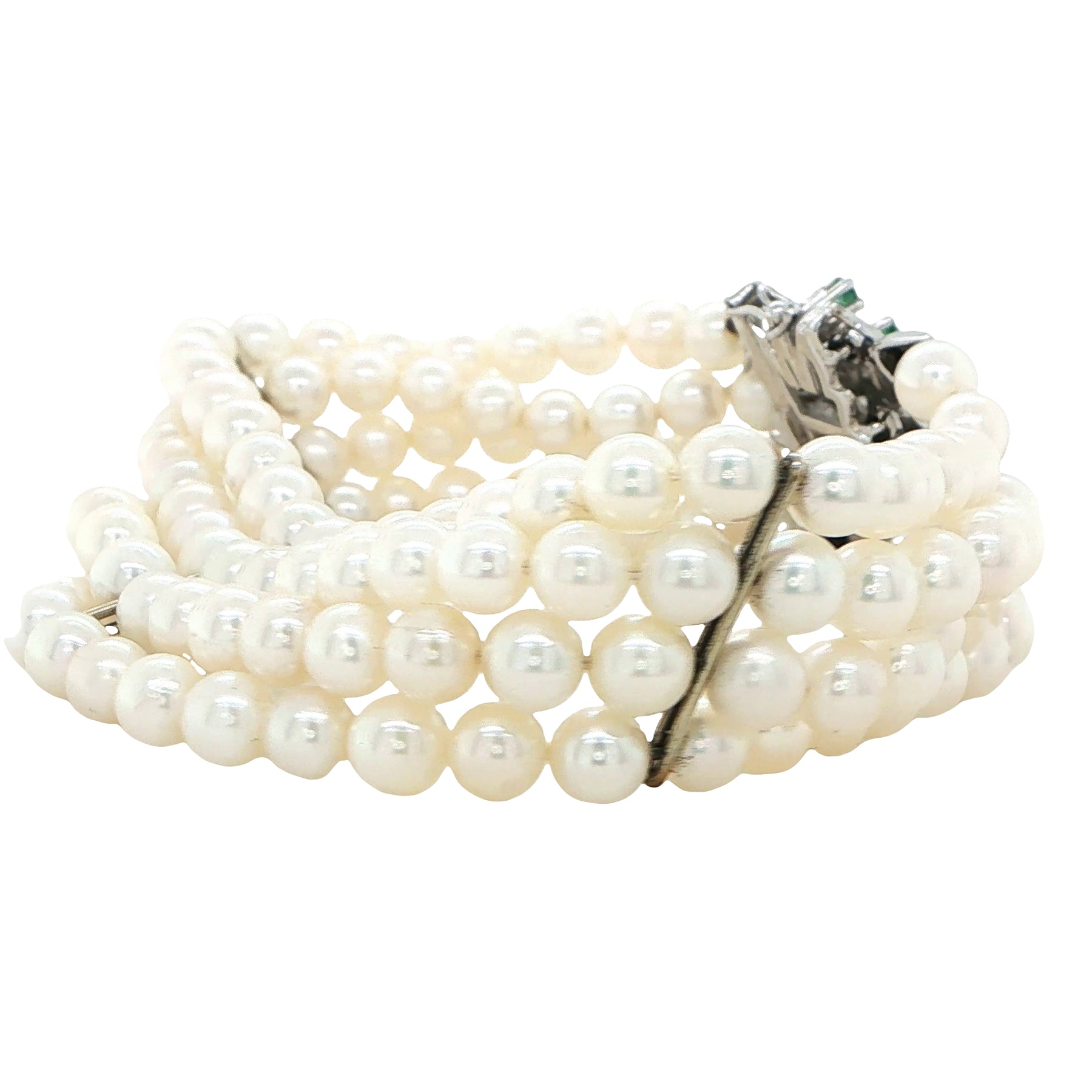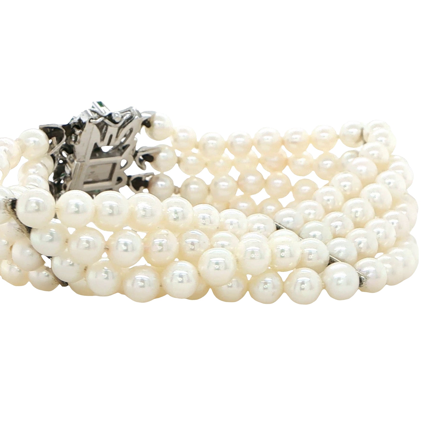 This 18 karat white gold 4 strand bracelet featuring 5mm cultured pearls accented by 19 round cut emeralds totaling 0.5 carats with length is 7.5 inches with hidden clasp and figure 8 safety weighing 36 grams total showcases elegant white gold bracelet construction with multi-strand design and pearl emerald combination. The cultured pearl bracelet offers four strand styling while emerald accent stones provide vibrant color contrast for luxury pearl jewelry appeal with substantial bracelet weight and secure clasp system. Pearl and emerald bracelet offers excellent investment grade jewelry value with multi-strand design perfect for fine jewelry collection and pearl jewelry enthusiasts seeking statement pearl bracelets and elegant bracelet styling with premium gemstone accents.