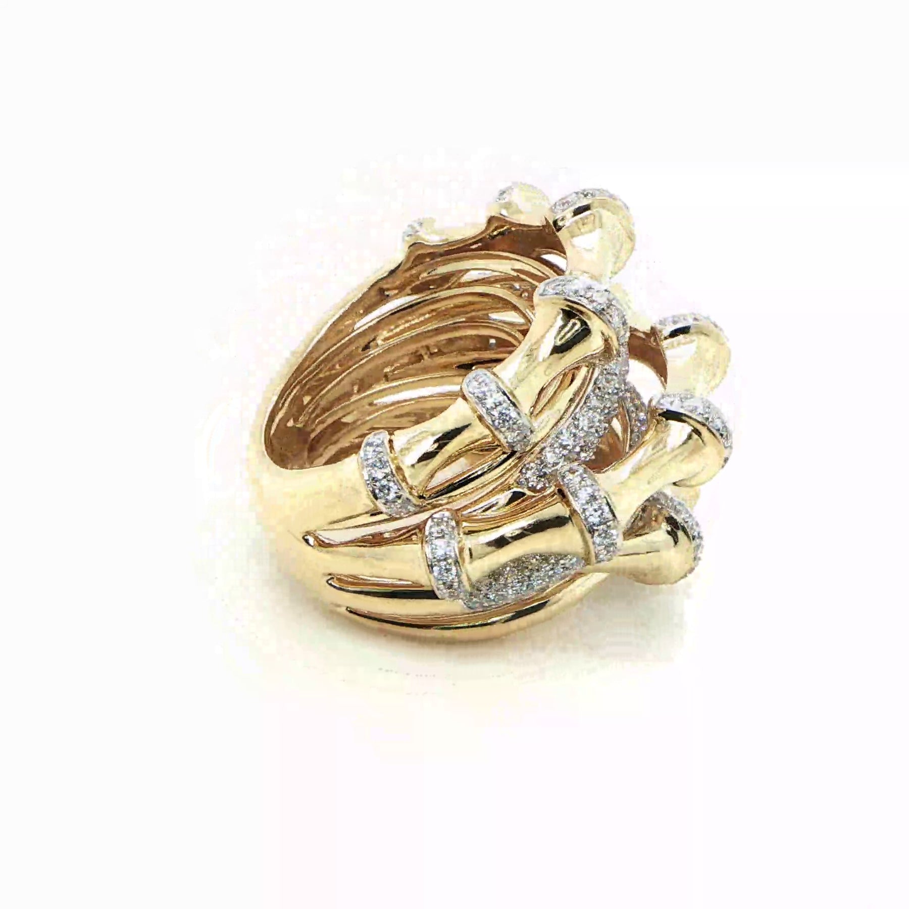 This exquisite 18K Yellow Gold Bamboo Diamond Ring captures the perfect balance of nature-inspired design and refined craftsmanship. Handcrafted in rich solid 18-karat gold, the band features a sculptural bamboo motif set with 218 round brilliant-cut diamonds of exceptional G/H color and VS clarity, totaling 2.18 carats. The diamond pavé detailing wraps seamlessly around the ring, radiating light from every angle while maintaining an effortlessly elegant silhouette. Designed for stacking or statement wear, this ring’s bold weight of 17.3 grams gives it a luxurious feel on the hand. With a finger size of 8.5, it offers perfect proportion and timeless sophistication—an ideal piece for collectors of distinctive, high-end gold jewelry.