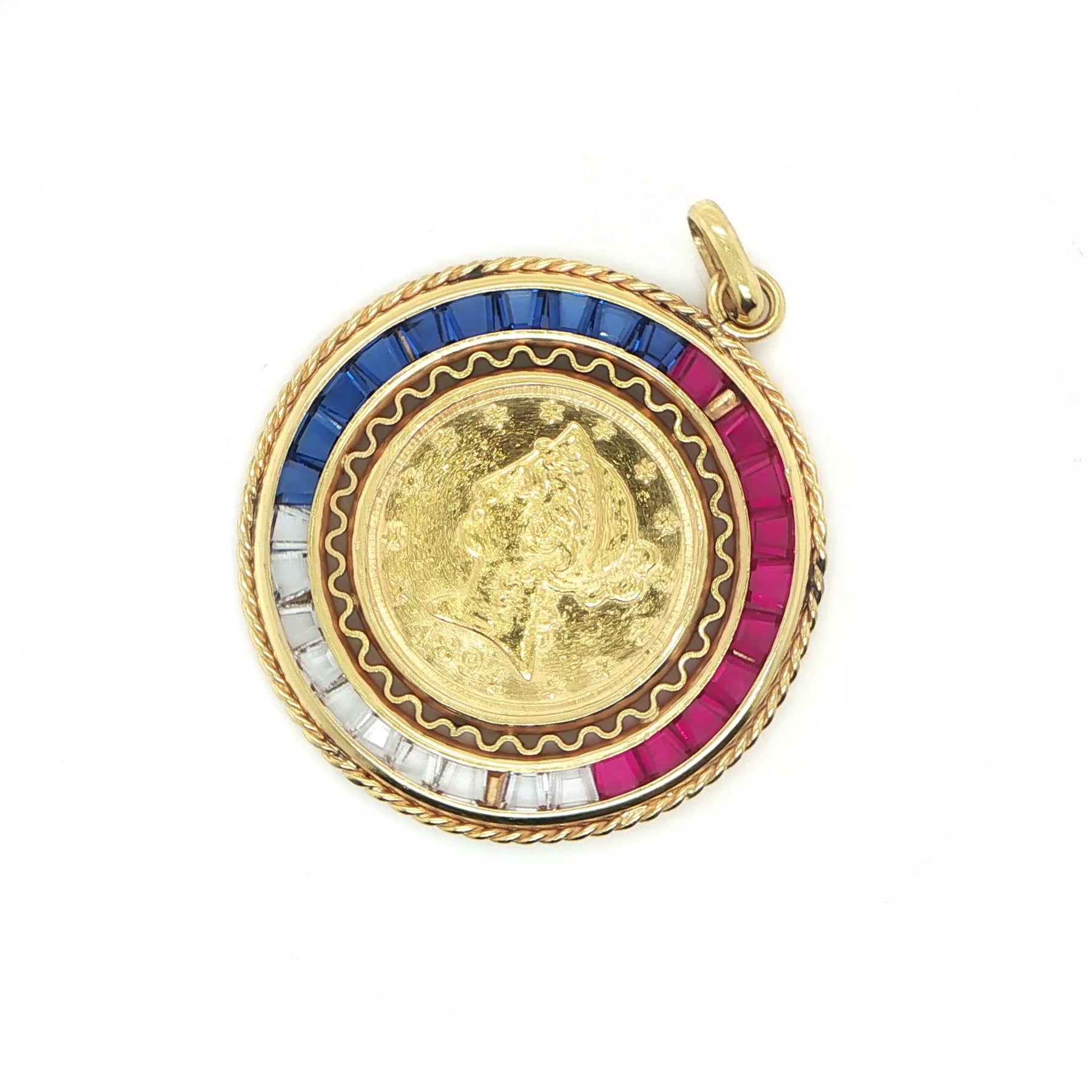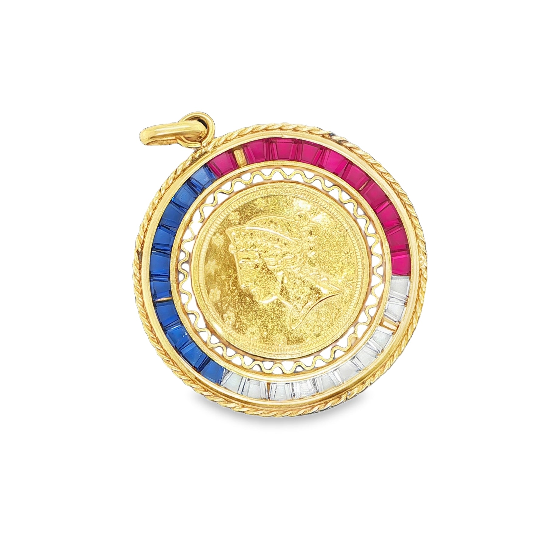 This striking pendant features an authentic 22 karat 1894 U.S. $5 Liberty Head gold coin, beautifully showcased in a custom 18 karat yellow gold bezel setting. Surrounding the historic coin is a decorative frame adorned with synthetic blue, red, and colorless gemstones, adding vibrant contrast and a bold, vintage aesthetic. The warm, high-karat gold highlights the intricate details of the Liberty design, making this pendant a meaningful collectible as well as a statement jewelry piece. With a substantial finished weight of 16.4 grams, the pendant feels luxurious and substantial when worn. Perfect for numismatic collectors, vintage enthusiasts, or anyone who appreciates jewelry with historical character and timeless style.