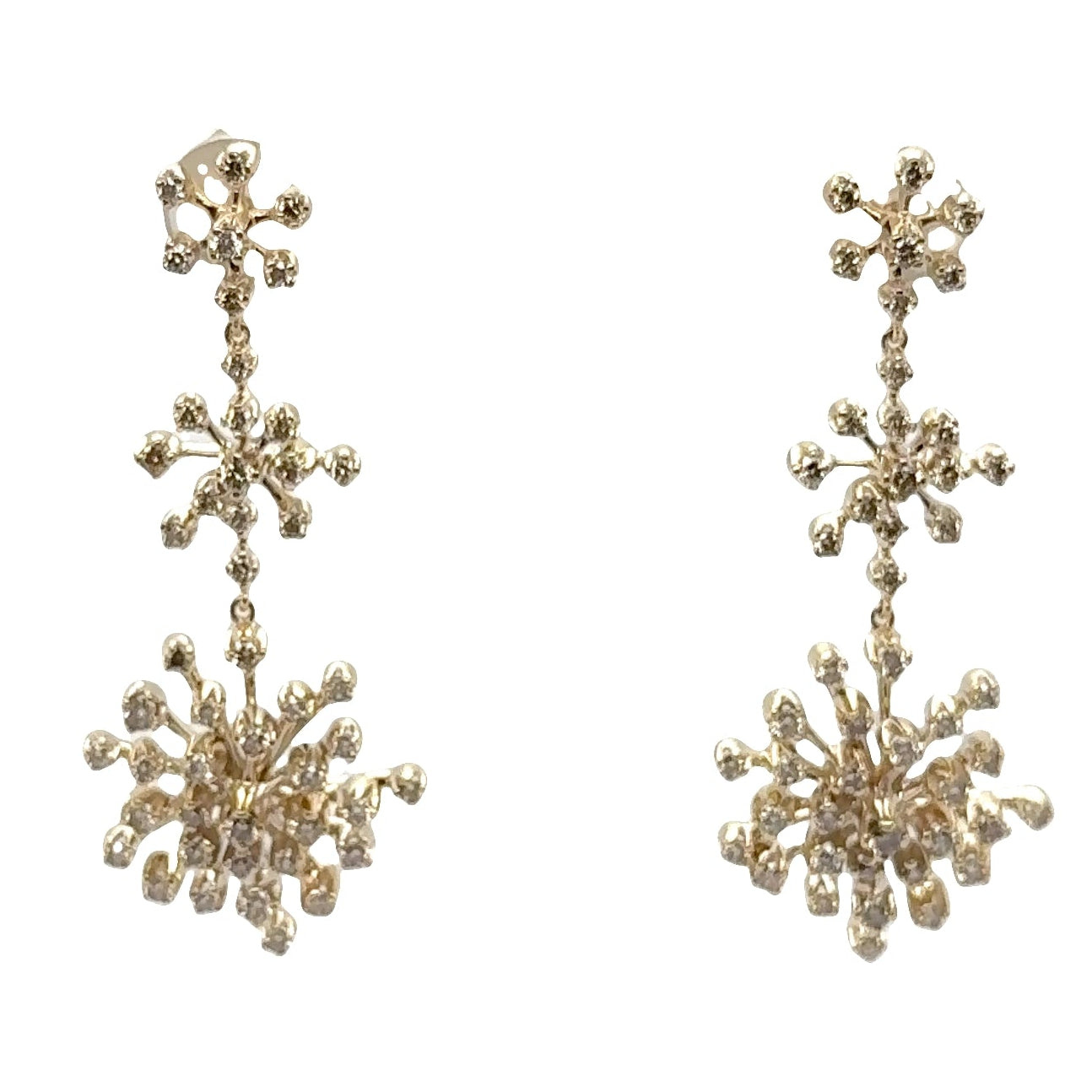 These H. Stern 18 karat noble gold snowflake drop earrings featuring 98 light brown diamonds with VS clarity diamonds totaling 1.76 carats with pierced post and friction back closure and finished weight of 13.3 grams with MSRP $7,500 showcase prestigious designer diamond earrings construction with snowflake design motif and cognac diamond quality. The H. Stern jewelry offers noble gold metal while brown diamond accents provide unique elegance for luxury designer jewelry appeal with substantial diamond weight and exclusive H. Stern craftsmanship. Designer drop earrings offer exceptional investment grade diamonds value with snowflake earring design perfect for fine jewelry collection and designer jewelry enthusiasts seeking H. Stern earrings and cognac diamond styling with premium designer quality.