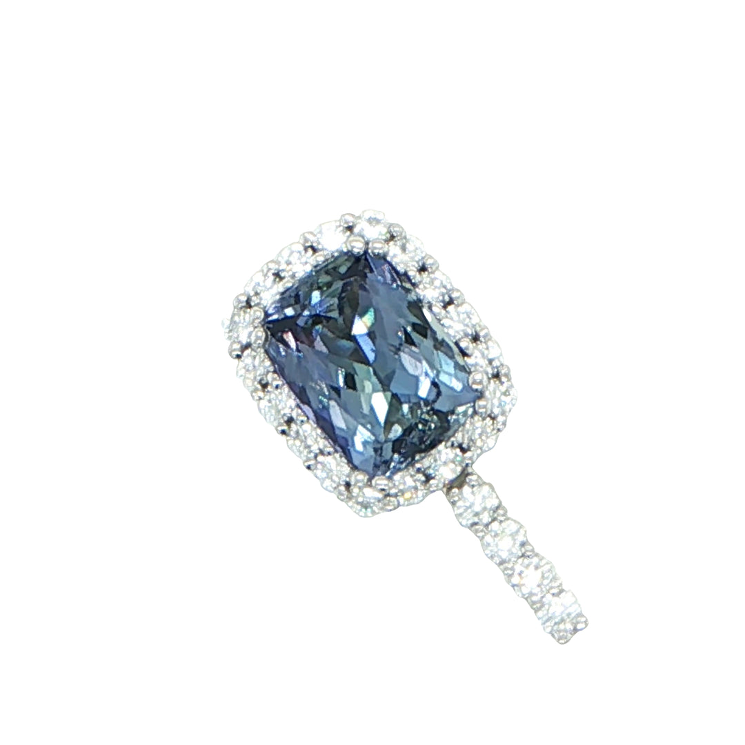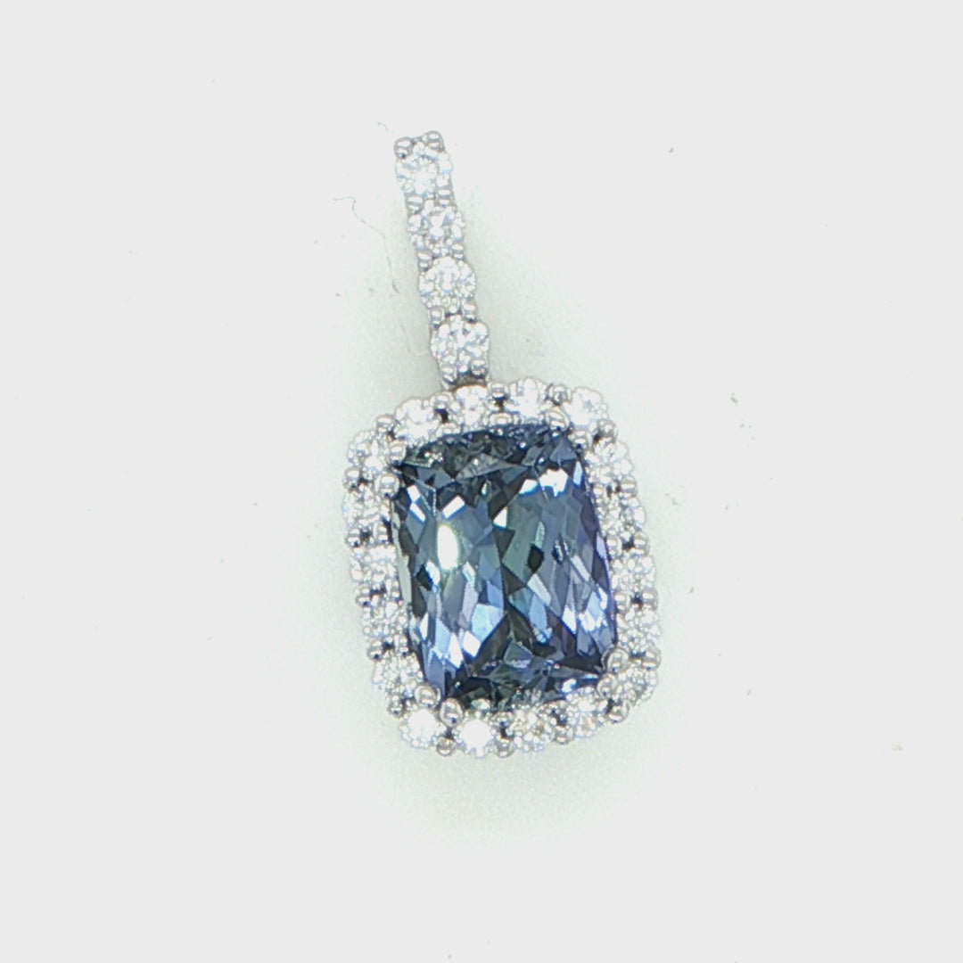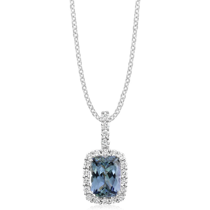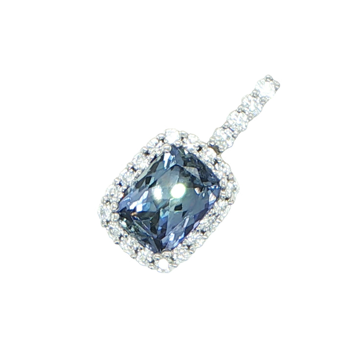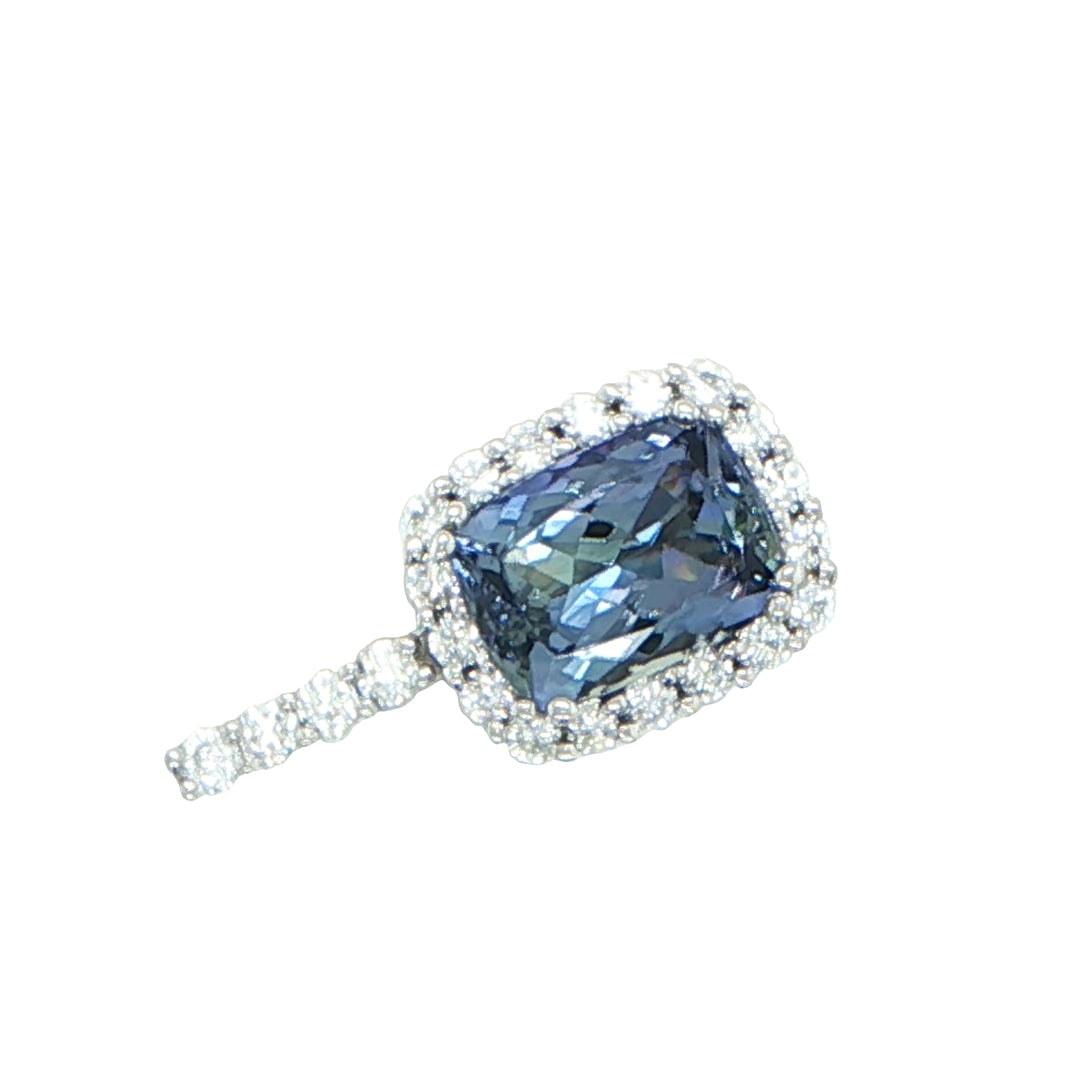 This platinum pendant featuring an elongated cut peacock tanzanite totaling 1.97 carats accented by 22 round cut diamonds with VS2/SI1 clarity diamonds and F/G color diamonds totaling 0.34 carats with length is 19mm including bail and finished weight of 3.3 grams showcases exceptional platinum jewelry construction with tanzanite diamond design and rare gemstone quality. The tanzanite pendant necklace offers peacock tanzanite color while diamond halo setting provides added brilliance for luxury gemstone jewelry appeal with elongated tanzanite cut and premium platinum setting. Gemstone diamond pendant offers excellent investment grade gemstones value with rare tanzanite quality perfect for fine jewelry collection and gemstone jewelry enthusiasts seeking tanzanite necklace pendants and exotic gemstone styling with platinum construction quality.