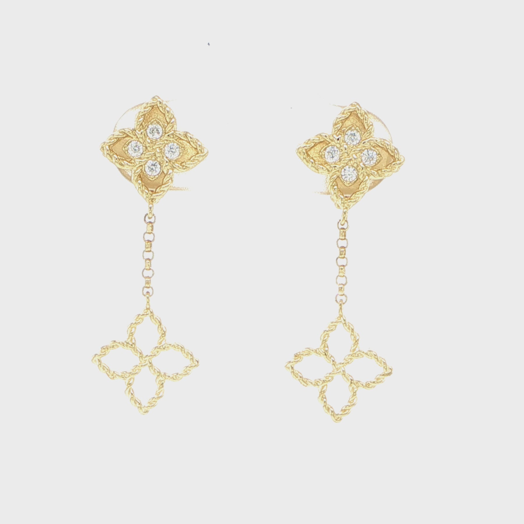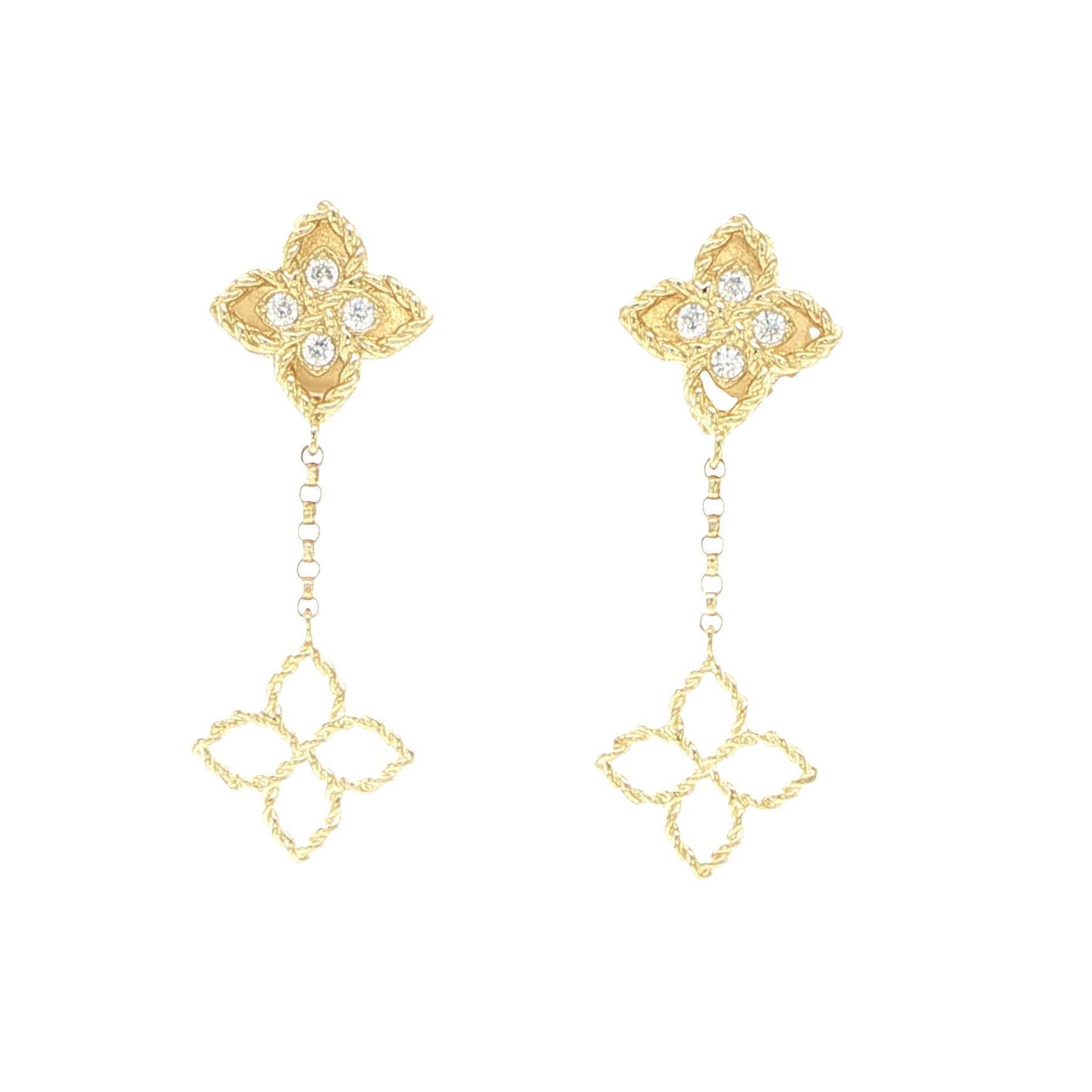 These Roberto Coin Love in Verona 18 karat yellow flower drop earrings featuring 8 round cut diamonds with SI clarity diamonds and G/H color diamonds totaling 0.05 carats accented by 1 round ruby with pierced post and friction back closure showcase romantic designer drop earrings construction with floral design motif and Roberto Coin signature. The Roberto Coin jewelry offers Love in Verona collection styling while diamond and ruby accents provide elegant sparkle for luxury designer jewelry appeal with flower drop design and signature ruby accent. Designer floral earrings offer excellent investment grade jewelry value with Roberto Coin quality perfect for fine jewelry collection and designer jewelry enthusiasts seeking Roberto Coin earrings and romantic drop styling with Italian craftsmanship.