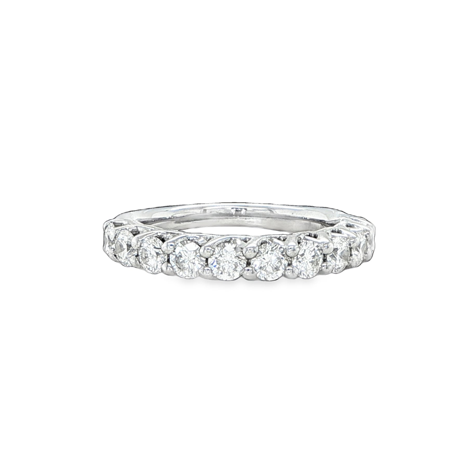 This 14 karat white gold shared prong wedding band featuring 11 round cut diamonds with VS clarity diamonds and G color diamonds totaling 0.9 carats for finger size 5 with finished weight of 3.2 grams showcases elegant white gold ring construction with shared prong setting and continuous diamond design. The diamond wedding band offers VS clarity quality while shared prong design provides maximum diamond sparkle for luxury diamond jewelry appeal with substantial diamond weight and secure prong setting. White gold band offers excellent investment grade diamonds value with anniversary band styling perfect for fine jewelry collection and bridal jewelry enthusiasts seeking diamond wedding rings and classic band styling with premium diamond quality.