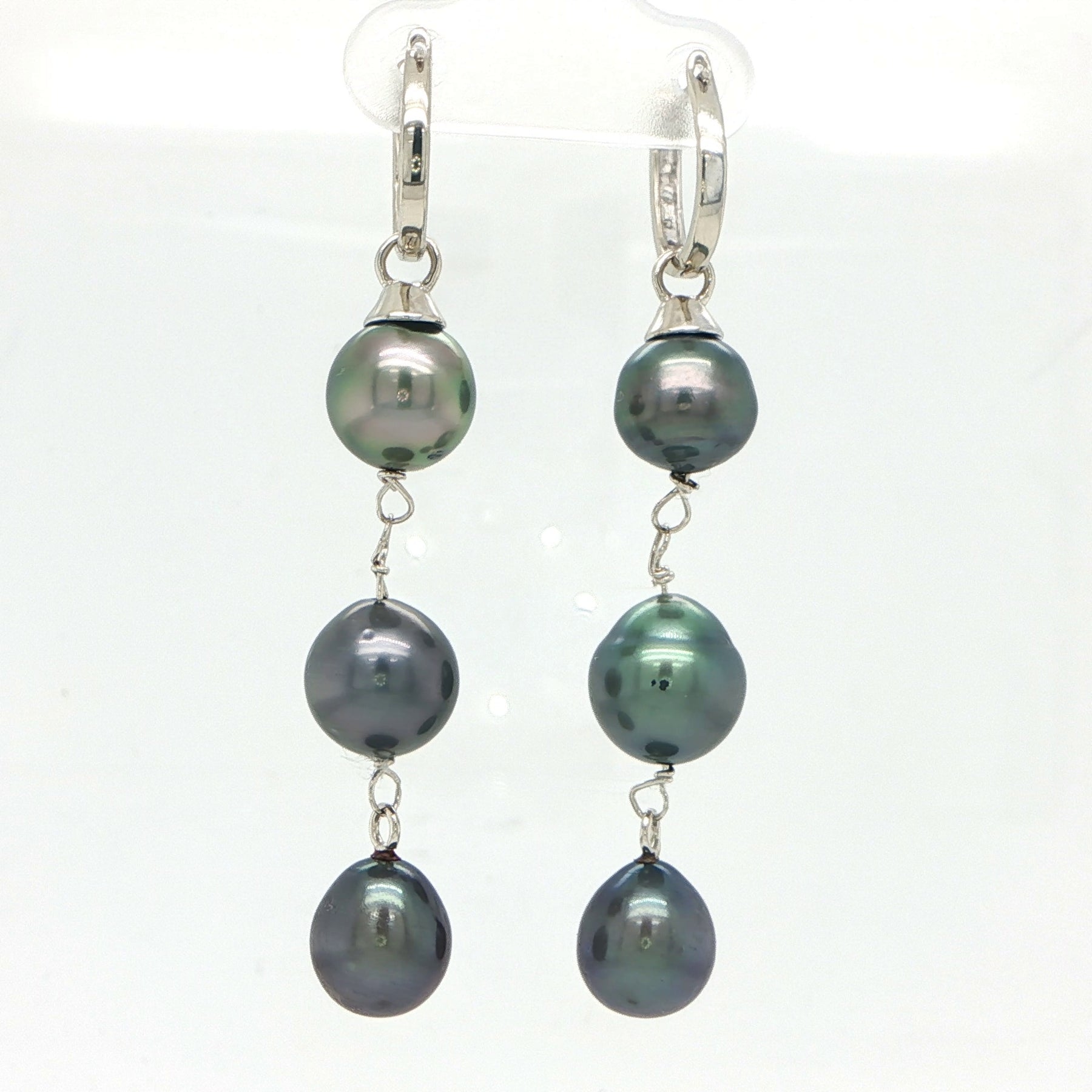 These exquisite 14 karat white gold huggie/drop earrings showcase two lustrous Tahitian pearls measuring 8.5–9mm, each displaying the signature deep, iridescent glow that makes Tahitian pearls so highly prized. Above each pearl, 14 round brilliant-cut diamonds totaling 0.70 carats add exceptional sparkle, graded VS clarity and H color for bright, refined brilliance. The design features huggie-style tops that transition into elegant pearl drops, creating a dramatic yet sophisticated silhouette. Measuring approximately 2 inches in length with a finished weight of 8 grams, these earrings offer luxurious presence with comfortable wear. A perfect choice for formal occasions and collectors of high-end pearl jewelry, this pair brings together timeless elegance and modern glamour.