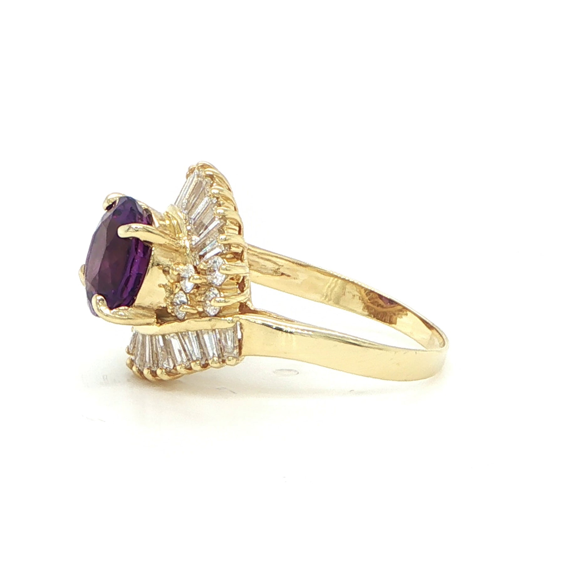 This bold and elegant 14 karat yellow gold fashion ring showcases a vibrant 9mm round-cut amethyst, celebrated for its rich purple color and eye-catching presence. Surrounding the center stone are 30 round brilliant-cut diamonds totaling 1.00 carat, each graded VS clarity and J color, adding bright sparkle and refined contrast. Crafted in solid 14K yellow gold, the polished setting enhances the saturation of the amethyst while elevating the brilliance of the diamonds. Designed in finger size 7.5 with a finished weight of 6.2 grams, this ring offers a substantial, luxurious feel. Perfect for statement jewelry lovers, this amethyst and diamond ring brings color, glamour, and timeless sophistication to any fine jewelry collection.