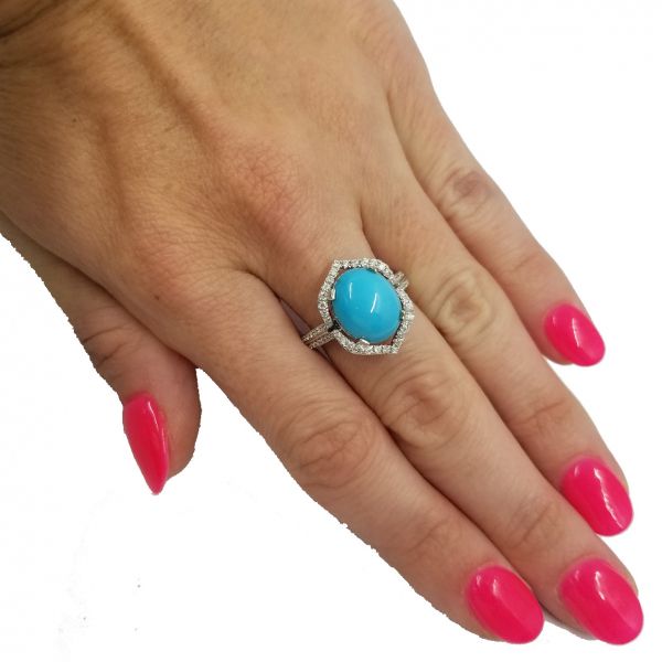 This turquoise and diamond ring is crafted in 14 Karat white gold and features a 4.50 Carat turquoise and diamonds totaling 0.30 Carat. In a finger size 7, Jae's Jewelers rings include a free ring sizing at check out if needed.