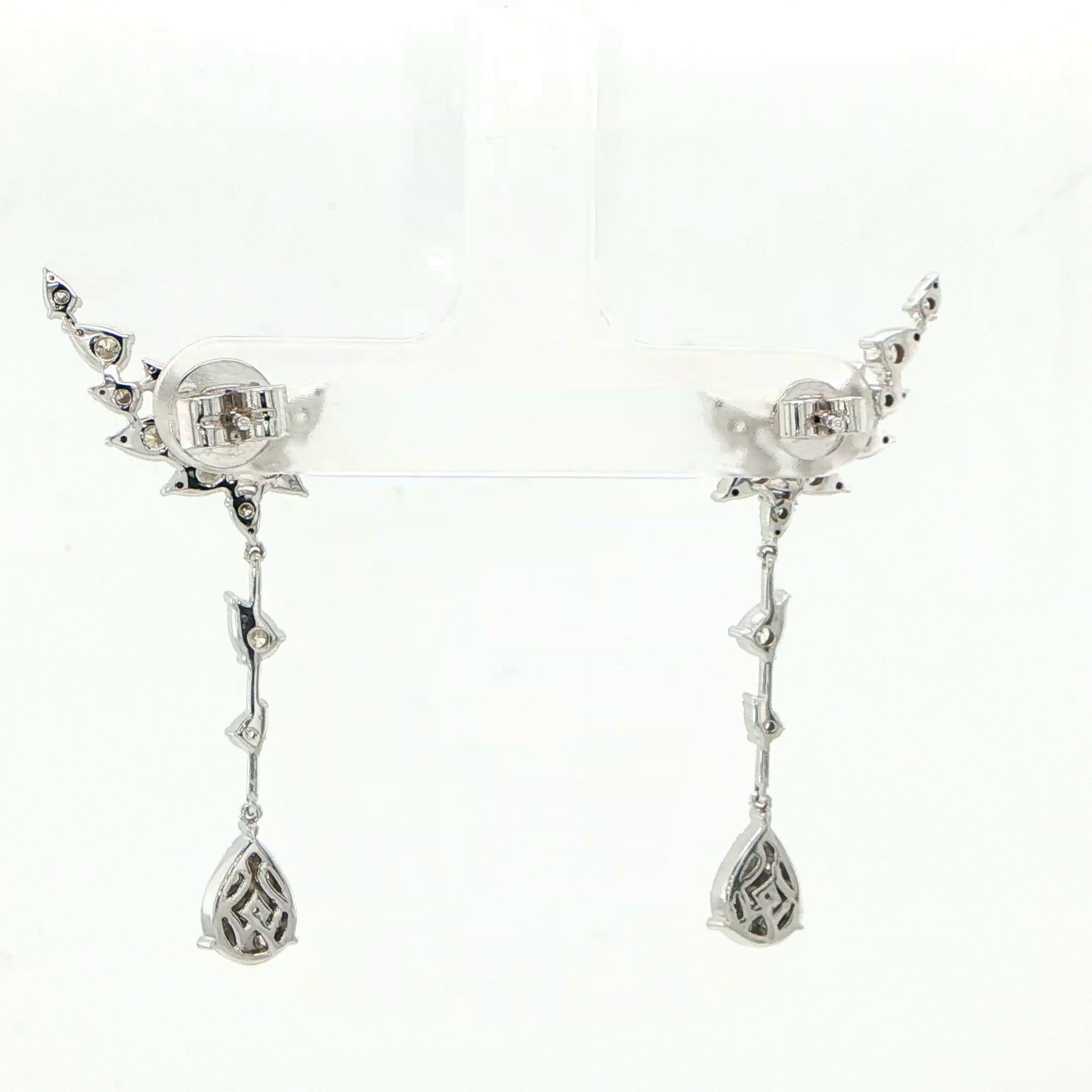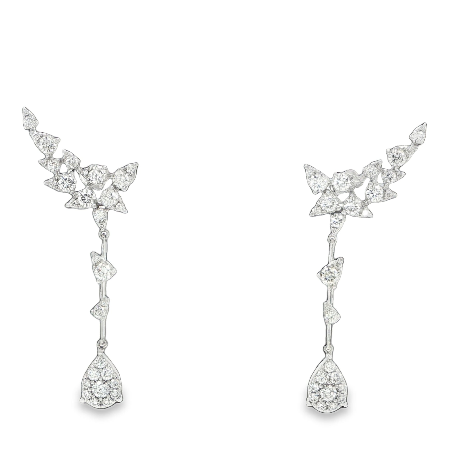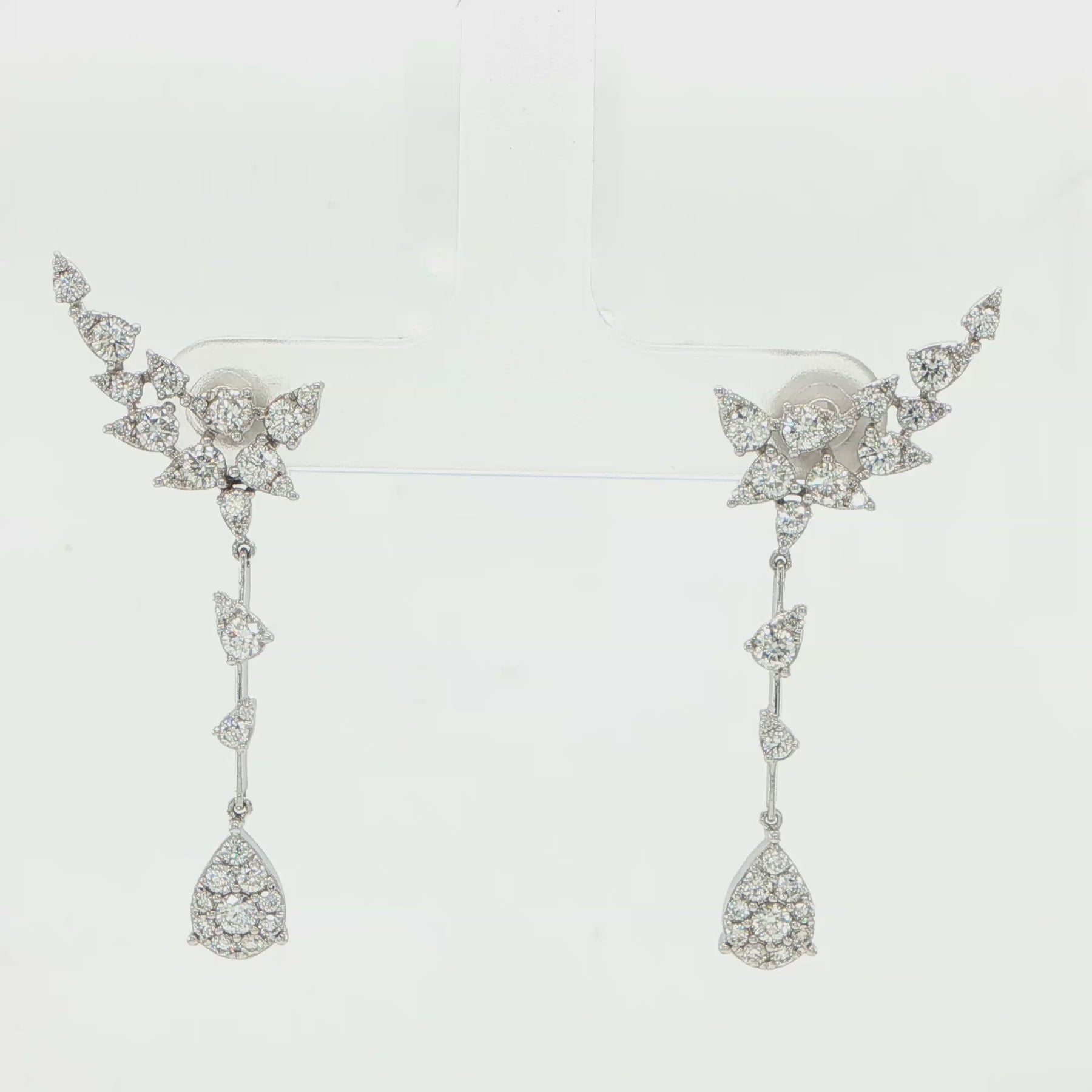 These stunning 14 karat white gold crawler and drop earrings showcase brilliant movement and radiant sparkle. Adorned with 68 round brilliant-cut diamonds totaling 1.97 carats, each stone offers exceptional brilliance and clarity. The design features a modern crawler-style top paired with an elegant drop silhouette, creating a refined, sculptural look that elongates the neckline. Crafted in solid 14K white gold, the earrings are finished with pierced posts and friction backs for secure, comfortable wear. Weighing 5.47 grams, these statement earrings balance sophistication and glamour—perfect for formal occasions or adding a touch of brilliance to everyday luxury.