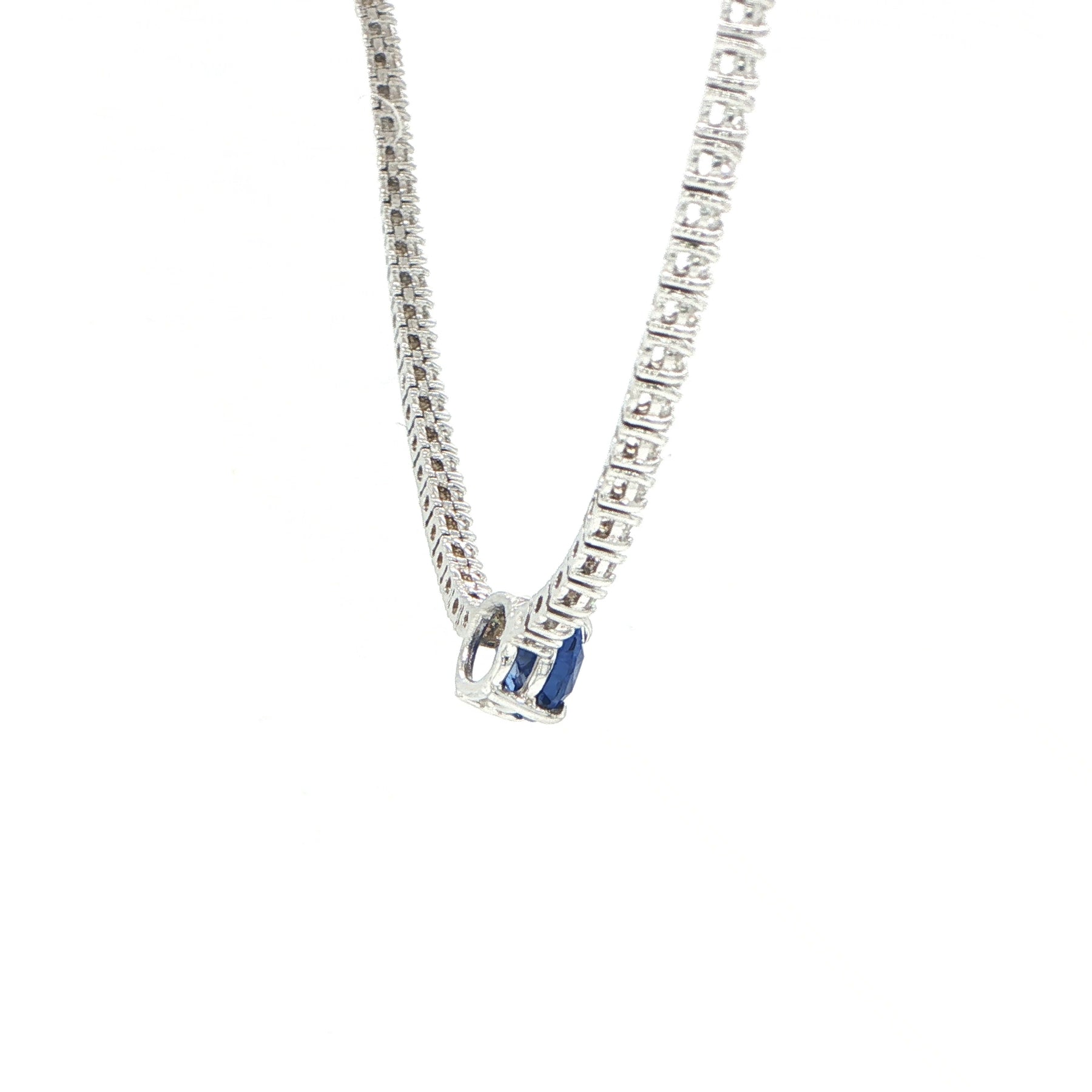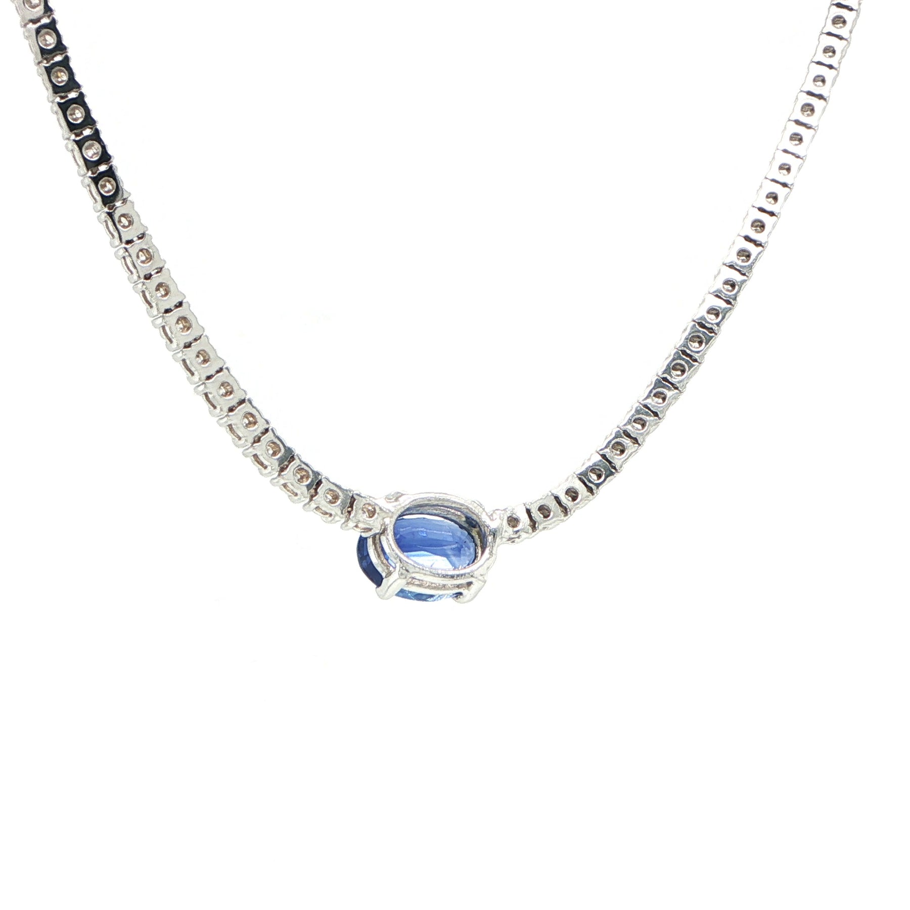 This exquisite 14 karat white gold tennis necklace showcases a vibrant 1.45 carat oval-cut blue sapphire as its striking centerpiece, radiating deep, elegant color. Surrounding the sapphire is a continuous line of round brilliant-cut diamonds totaling 4.30 carats, each graded VS clarity and G/H color for exceptional brilliance and fire. Crafted in solid 14K white gold, the necklace delivers a refined, high-polish finish that beautifully enhances the diamonds’ sparkle. Measuring 17 inches, it sits gracefully at the collarbone and secures with a sturdy box clasp and figure-8 safety. With a finished weight of 12.82 grams, this sapphire and diamond tennis necklace is the ultimate statement of luxury—perfect for formal occasions, milestone celebrations, and fine jewelry collectors.