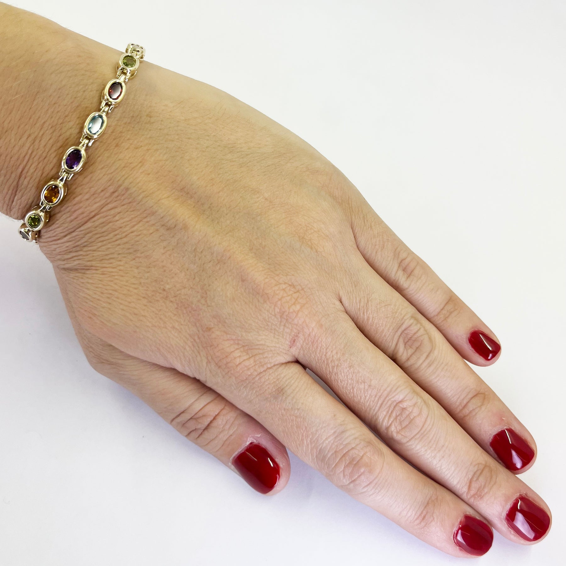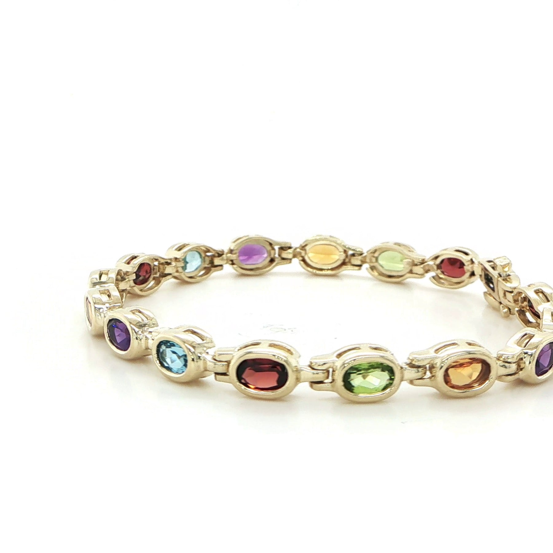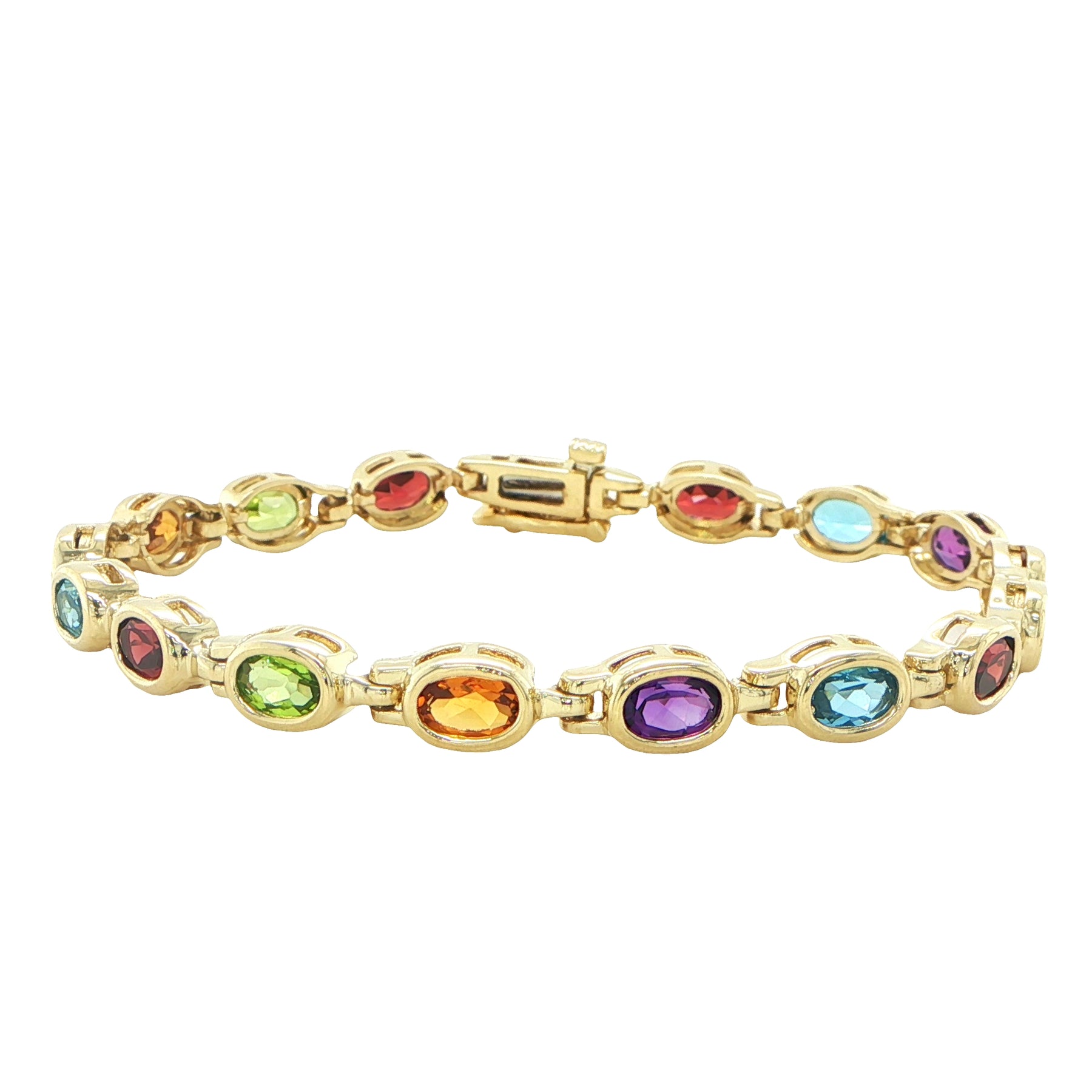 This vibrant 14 karat yellow gold rainbow bracelet features a stunning sequence of oval-cut gemstones — garnet, peridot, citrine, amethyst, and sky blue topaz — each meticulously bezel-set to highlight its vivid natural color. Crafted in solid 14K yellow gold, the bracelet’s warm tone enhances the brilliance of each gem, creating a radiant, multicolored display. Measuring 7 inches in length, it secures with a hidden box clasp and figure-eight safety for both style and security. With a finished weight of 13.1 grams, this bracelet offers a luxurious feel and smooth comfort on the wrist. Perfect for gemstone enthusiasts, this rainbow gemstone bracelet is a joyful expression of elegance, color, and craftsmanship.