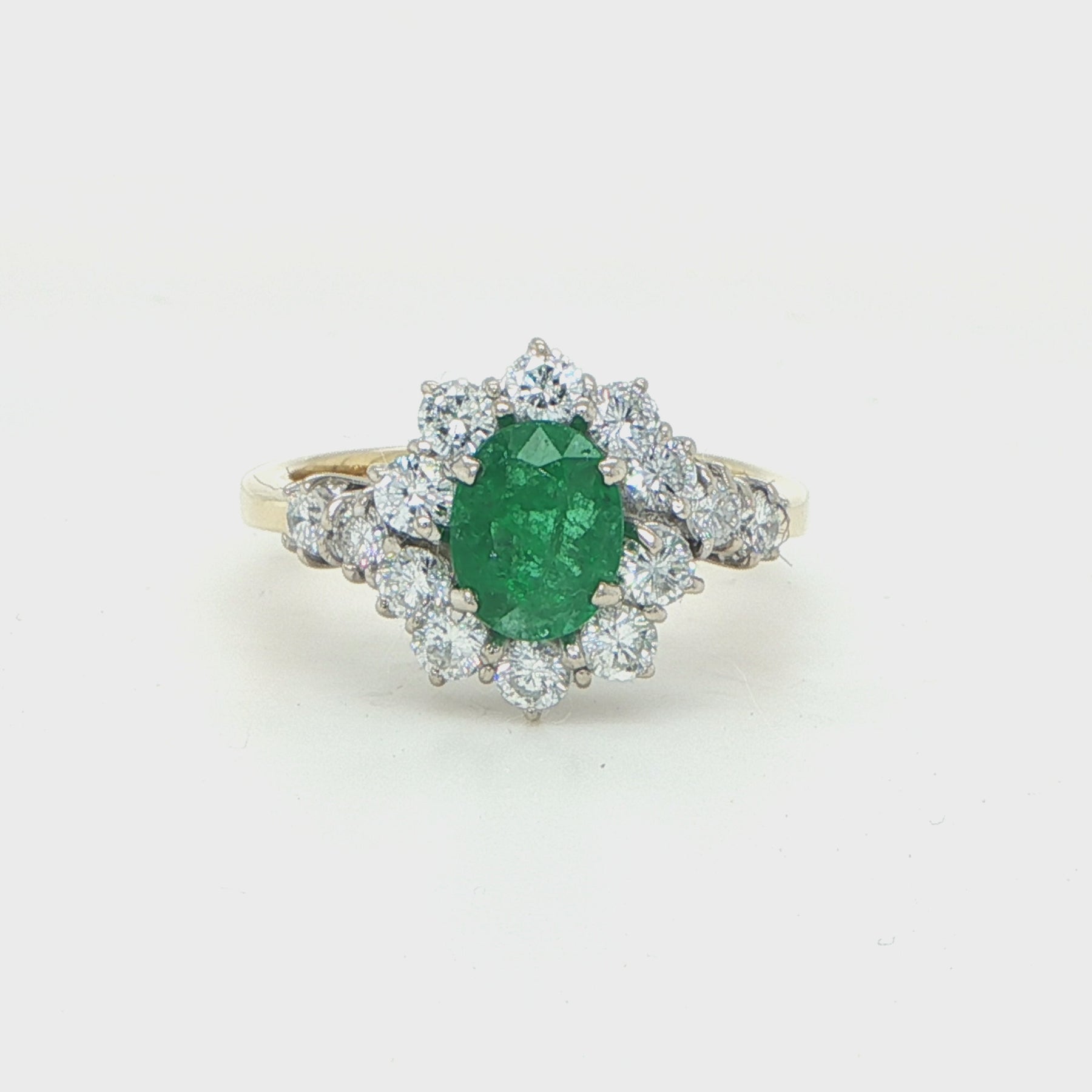This exquisite 18 karat yellow and white gold fashion ring showcases a vibrant 1.00 carat oval-cut emerald, prized for its rich green color and timeless elegance. Surrounding the center gemstone is a brilliant halo of 14 round-cut diamonds totaling 1.00 carat, each graded VS clarity and G color for exceptional sparkle and refined brilliance. The two-tone 18K gold setting enhances the contrast between the emerald and diamonds, giving the ring a luxurious, multidimensional look. Designed in finger size 6.75 with a finished weight of 6 grams, this piece offers a balanced, substantial feel while maintaining comfortable wear. A stunning statement ring perfect for emerald lovers, anniversaries, or special-occasion fine jewelry.