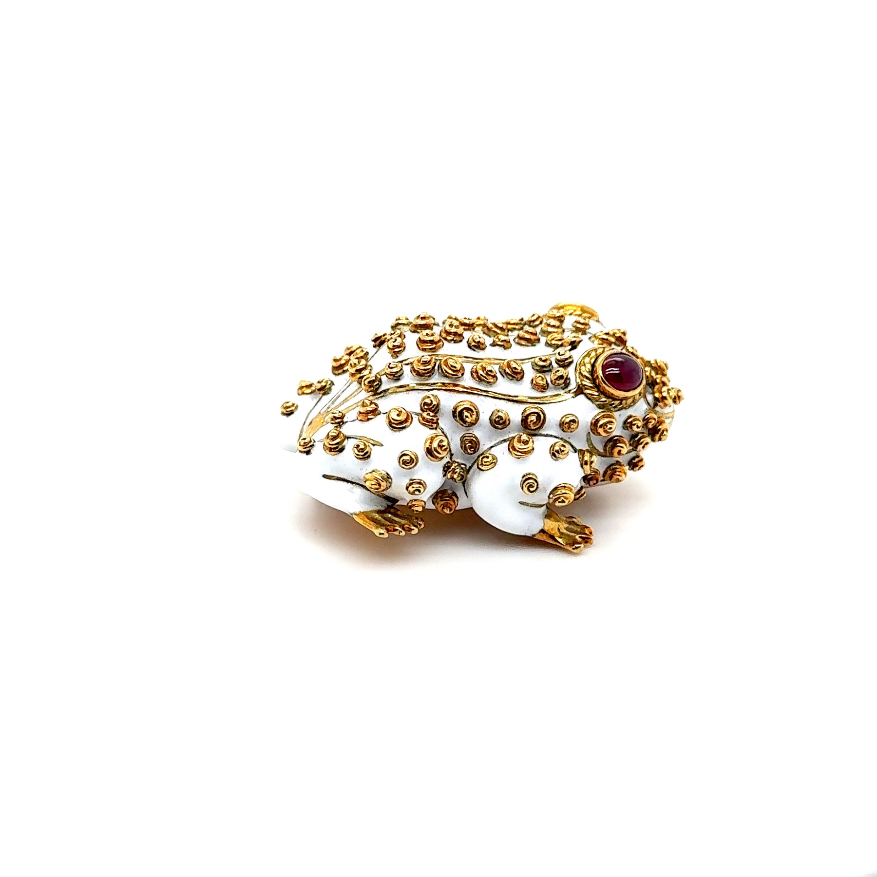 This authentic 1960s David Webb 18 karat yellow gold frog brooch features exquisite white enamel detailing and 2 ruby eye accents in iconic David Webb design measuring 1.75 x 1.25 inches with substantial 47.8 grams weight. The vintage designer brooch includes secure pin and locking catch mechanism at back and comes with original David Webb box for complete authentication while yellow gold construction showcases vintage animal jewelry craftsmanship. Collectible David Webb offers exceptional investment grade jewelry value with 1960s vintage brooch styling perfect for luxury jewelry collection and estate jewelry enthusiasts seeking authentic designer pieces and mid-century modern jewelry.