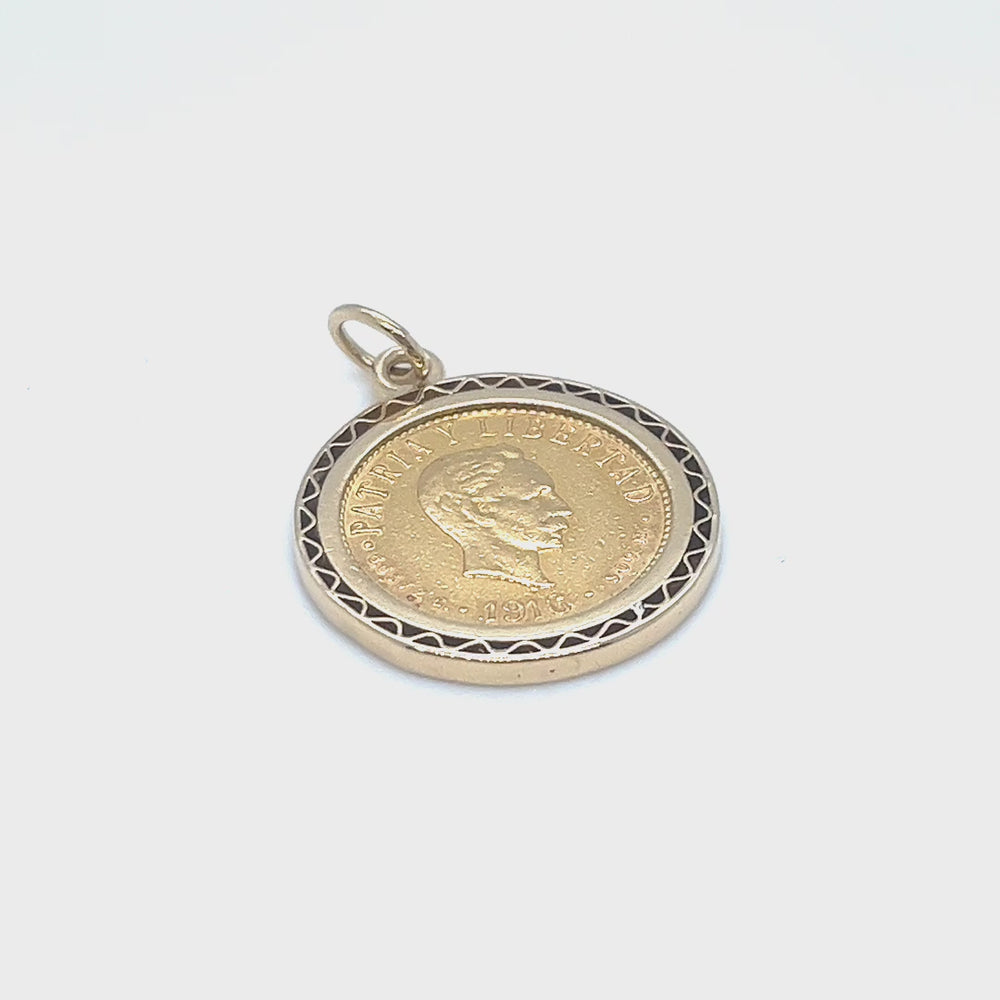 This authentic 22 karat gold cuatro pesos Cuban coin circa 1916 is professionally mounted in an 18 karat yellow gold bezel setting for secure wearability and protection. The vintage Cuban coin features original 22k gold content while the gold coin jewelry construction weighs 9.5 grams total combining both metals. Historical gold coin from early 20th century offers collectible coin jewelry value with bezel setting design that preserves coin integrity for investment grade coin and antique coin pendant enthusiasts.