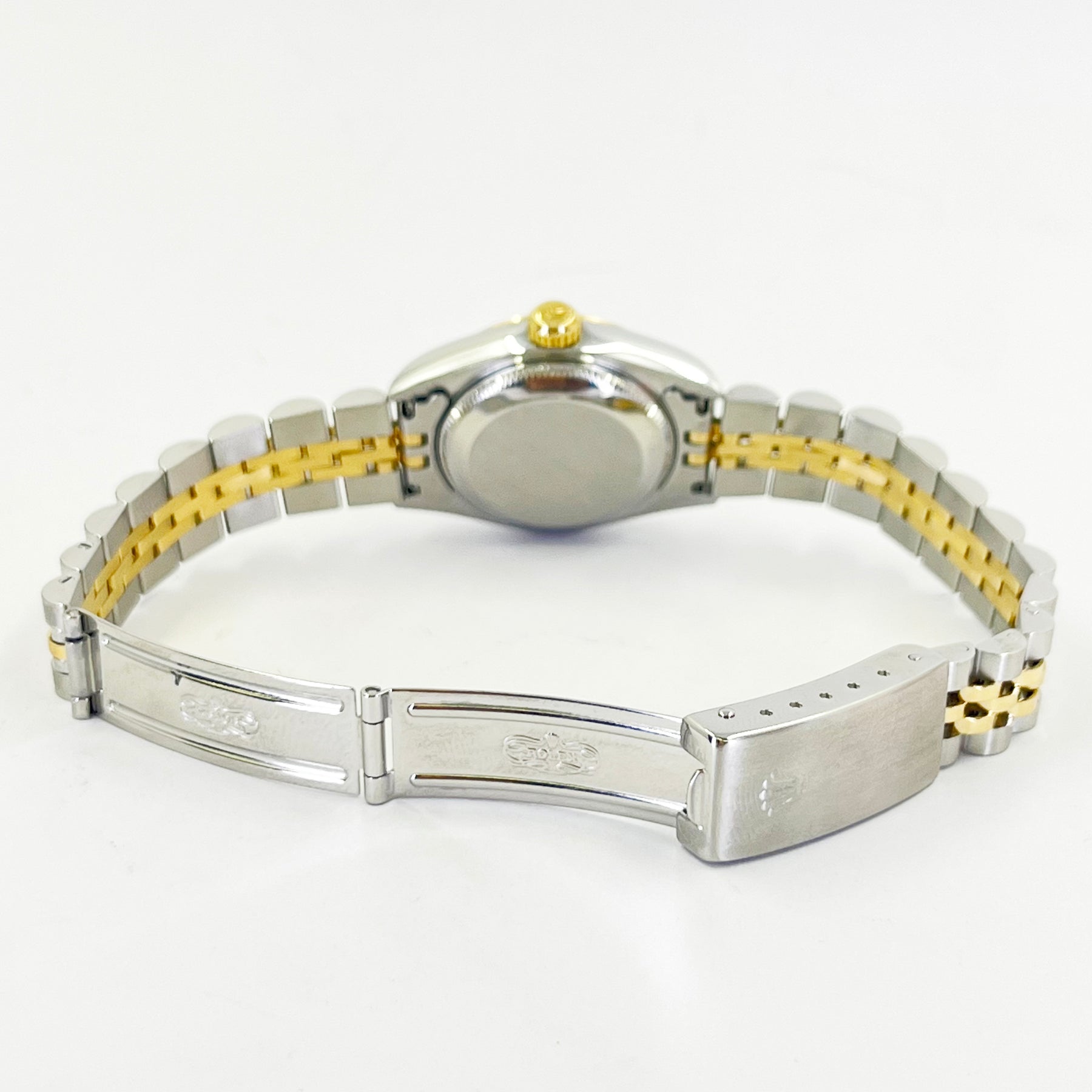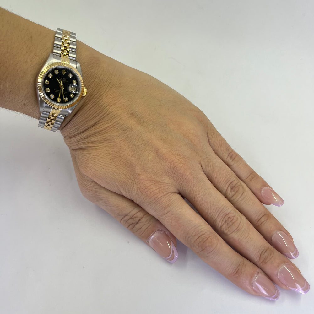 This pre-owned Rolex Datejust 26mm is a timeless classic crafted in a luxurious blend of 18 karat yellow gold and stainless steel. Featuring a sleek black factory dial set with diamond hour markers, this model offers a striking contrast and elevated sophistication. Powered by an automatic movement, the watch delivers reliable precision and enduring performance. This piece dates to 1997 and has been professionally polished and regulated in October 2025, ensuring optimal condition for everyday wear. With its iconic fluted bezel, Jubilee-style bracelet construction, and signature Rolex detailing, this Datejust embodies elegant versatility perfect for collectors and daily luxury watch enthusiasts alike.
