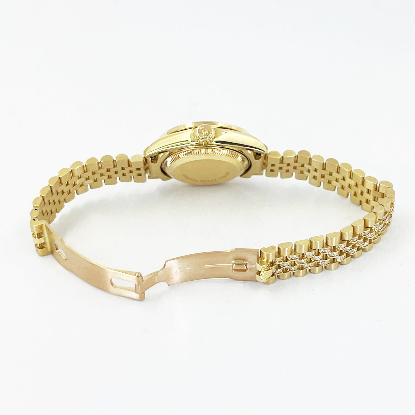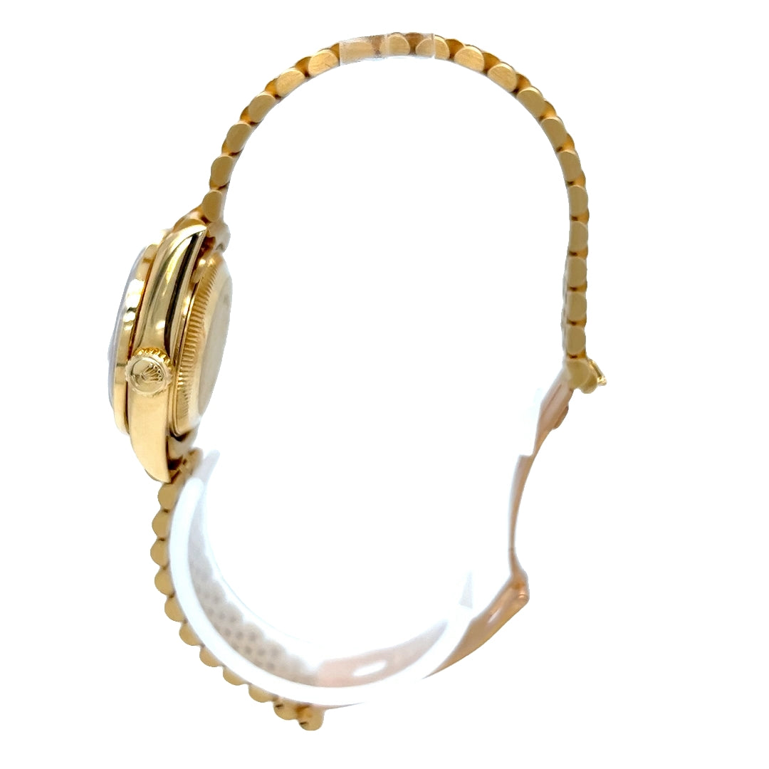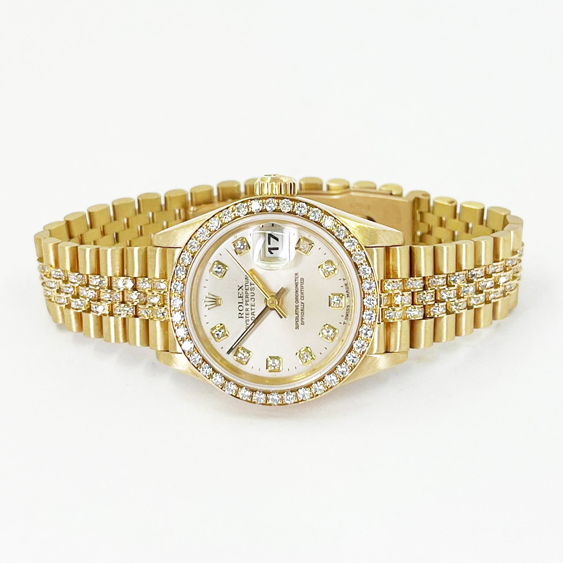 This pre-owned Rolex Datejust is crafted in luxurious 18 karat yellow gold and features a 26mm case. The factory silver diamond dial is paired with a diamond bezel, creating a timeless and elegant look. Completing the design is a full pave-set President bracelet, adding exceptional brilliance to the piece.