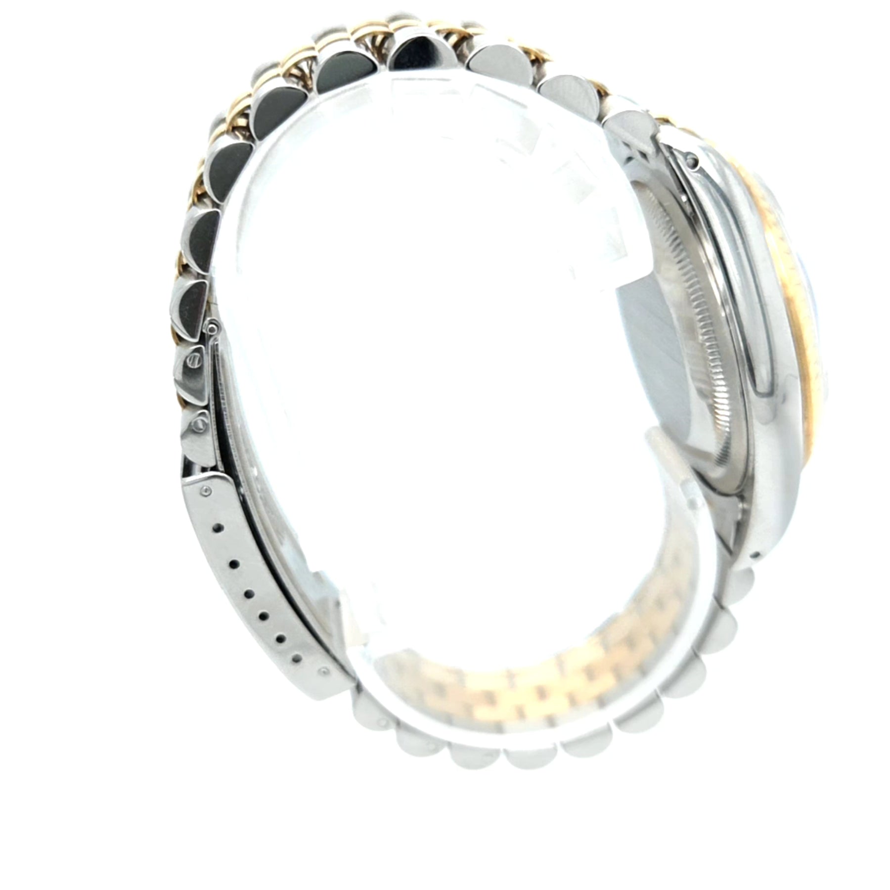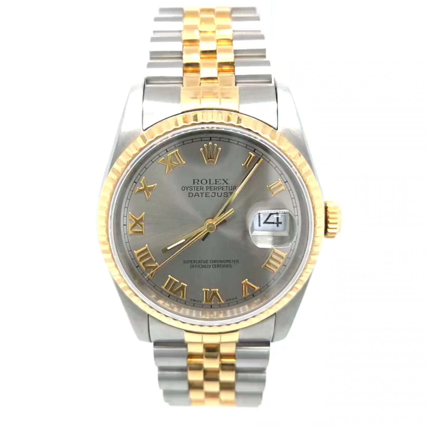 This pre-owned 36mm Rolex Datejust automatic watch is crafted in 18 karat yellow gold and steel, with rhodium roman dial and fluted bezel on Jubilee bracelet. Model 16233, R serial number circa 1988.