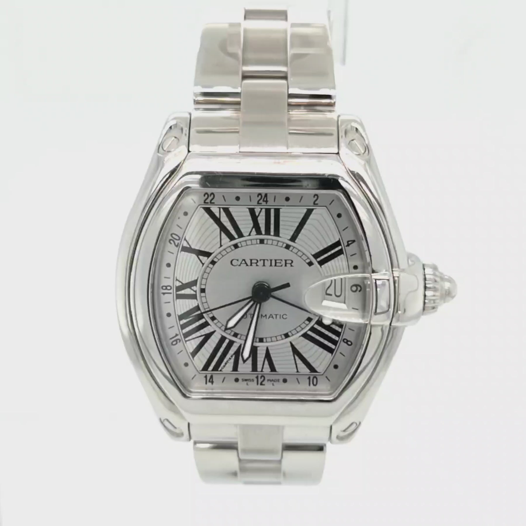 This pre-owned Cartier Roadster GMT automatic watch embodies the bold and sporty elegance of the Roadster collection. Crafted in stainless steel, the 38mm case highlights Cartier’s signature tonneau (barrel) shape with a smooth bezel and streamlined design.