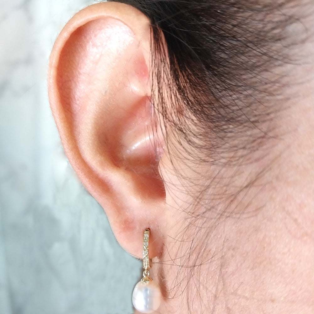 14 Karat Gold Dangle Huggie Earrings Featuring Two 8mm Cultured Pearls Accented by 8 Round Diamonds of SI Clarity and G/H Color Totaling 0.04 Carats. Pierced Post with Hinged Clip Back. Style E1090PEY