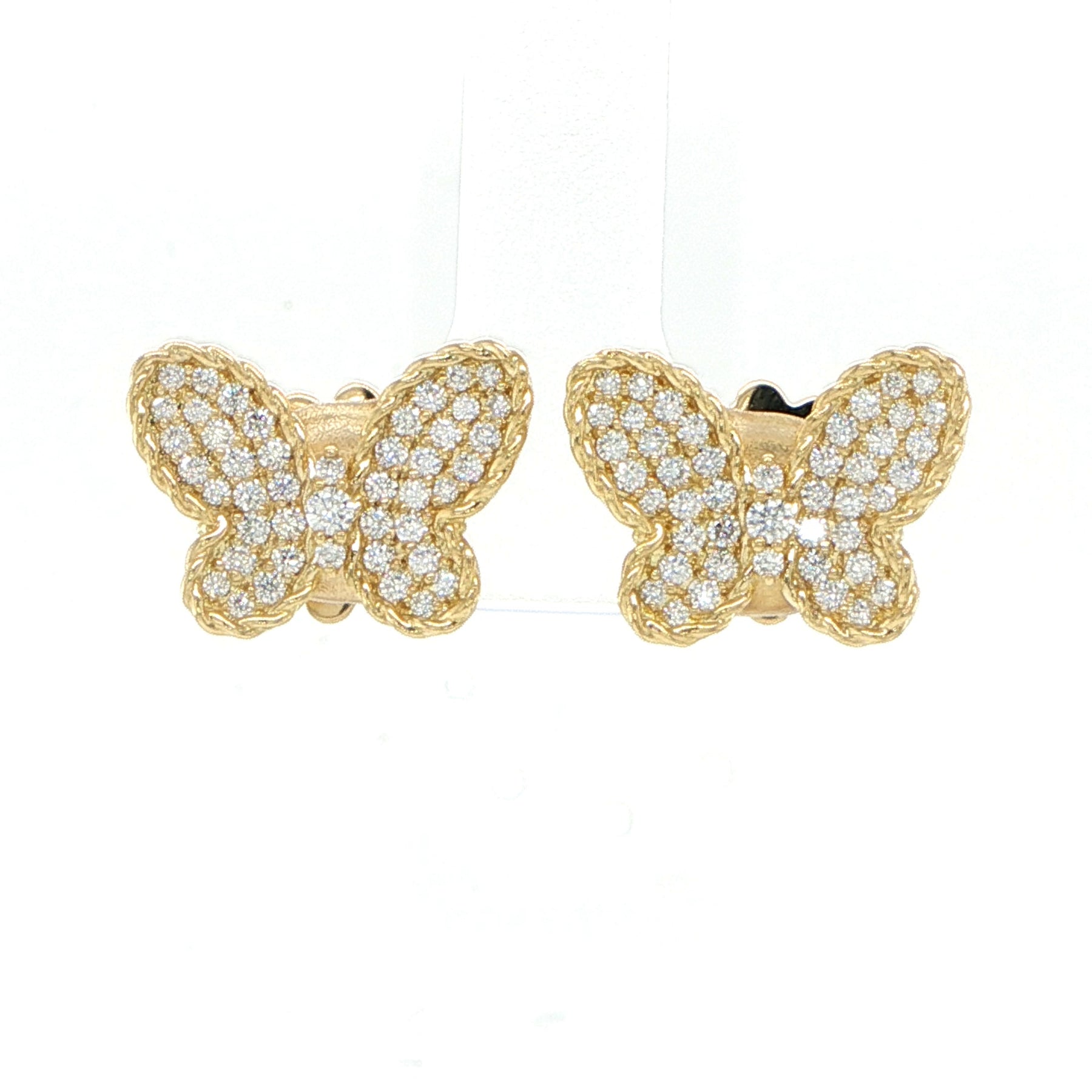 These Roberto Coin 18 karat yellow gold pave diamond butterfly stud earrings from the Jasmine collection featuring 0.68 carat total weight round brilliant cut diamonds of SI clarity diamonds and G/H color diamonds with friction post and nut closure showcase exquisite designer stud earrings construction with butterfly design motif and Roberto Coin quality. The pave diamond earrings offer butterfly earring styling while substantial diamond weight provides exceptional sparkle for luxury designer jewelry appeal with nature inspired design and Italian craftsmanship. Designer butterfly earrings offer excellent investment grade diamonds value with Roberto Coin authenticity perfect for fine jewelry collection and designer jewelry enthusiasts seeking butterfly stud earrings and pave diamond styling with signature Jasmine collection.